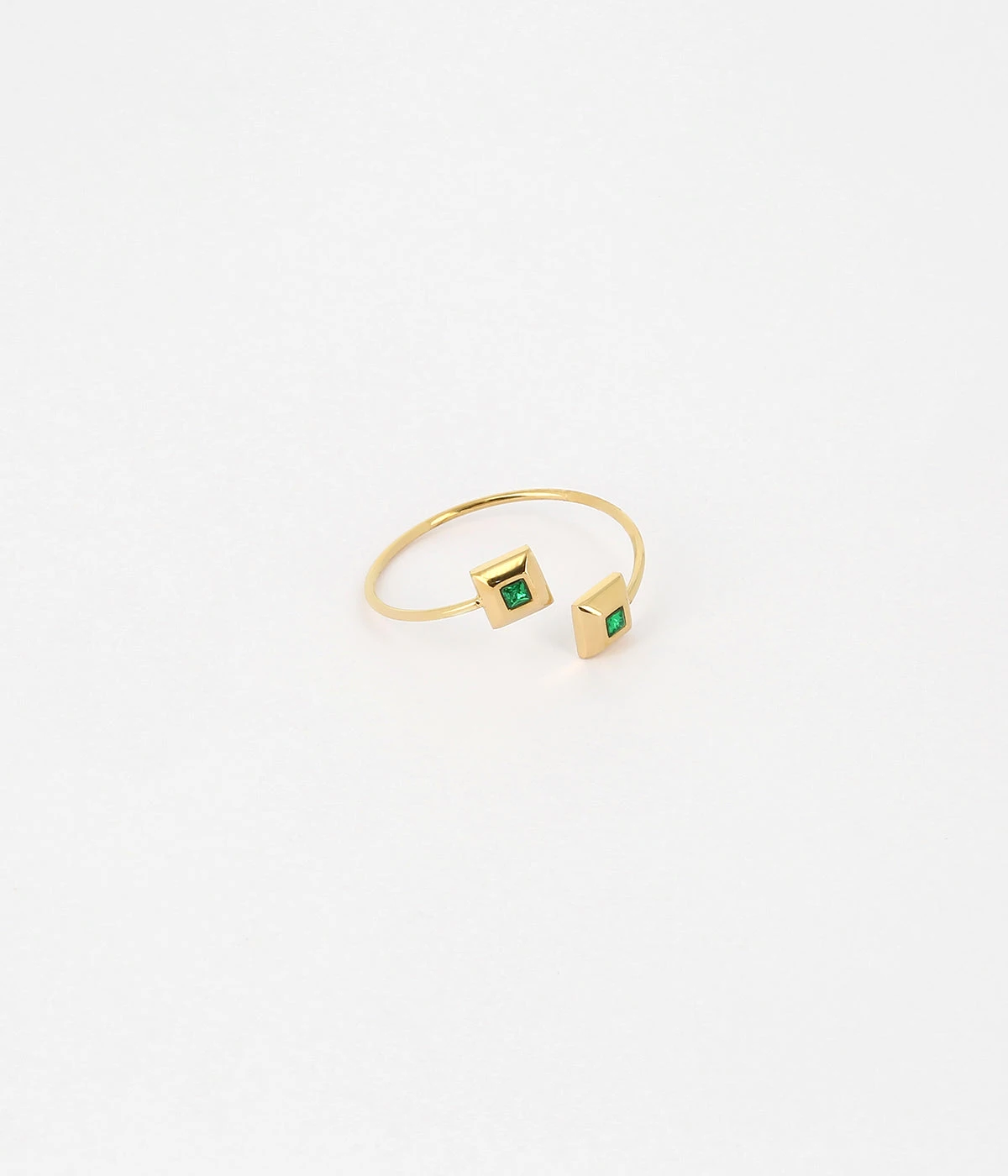 Bague en acier uni ou doré à l’or fin sur laquelle deux petits carrés constitués de zirconiums colorés sont présentés aux extrémités.
