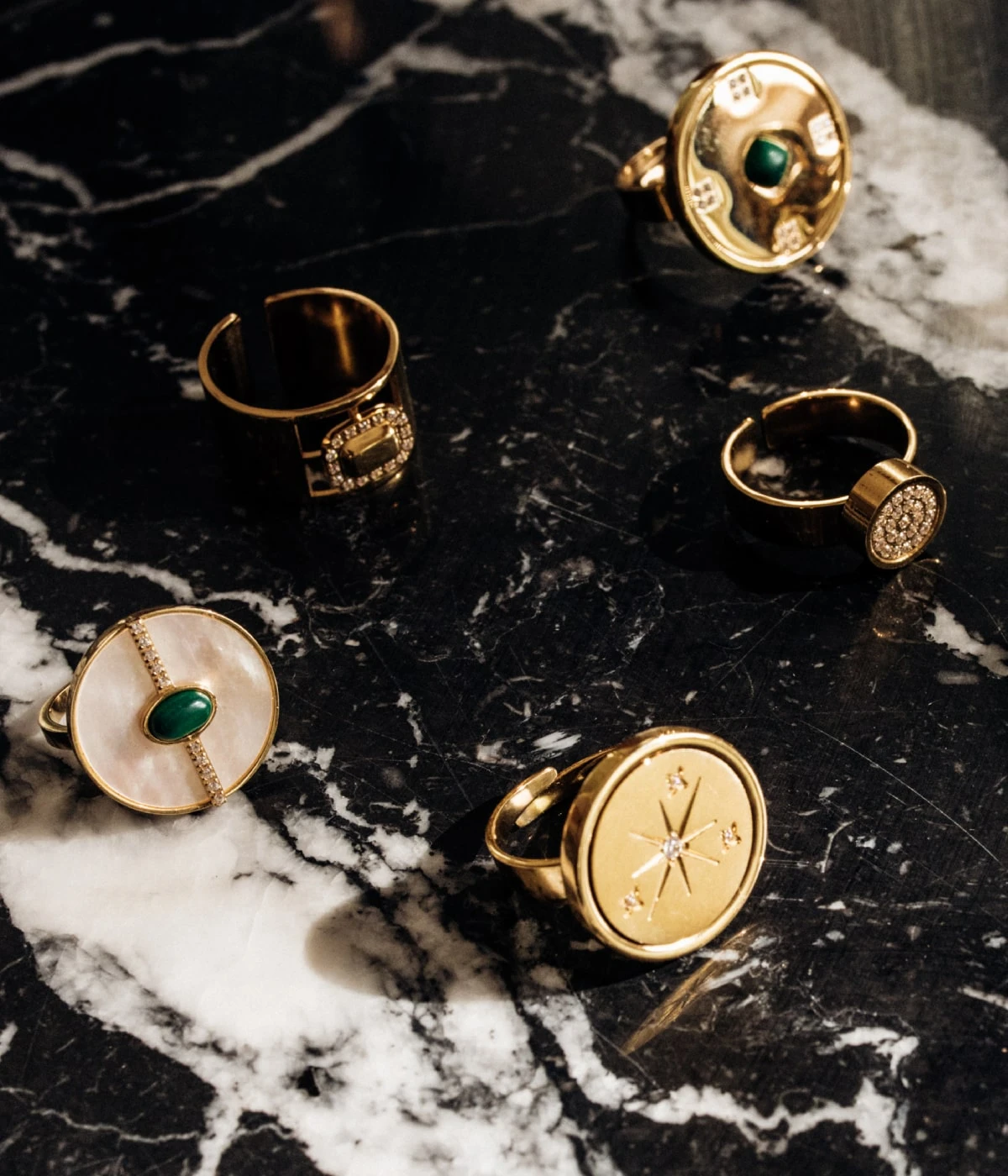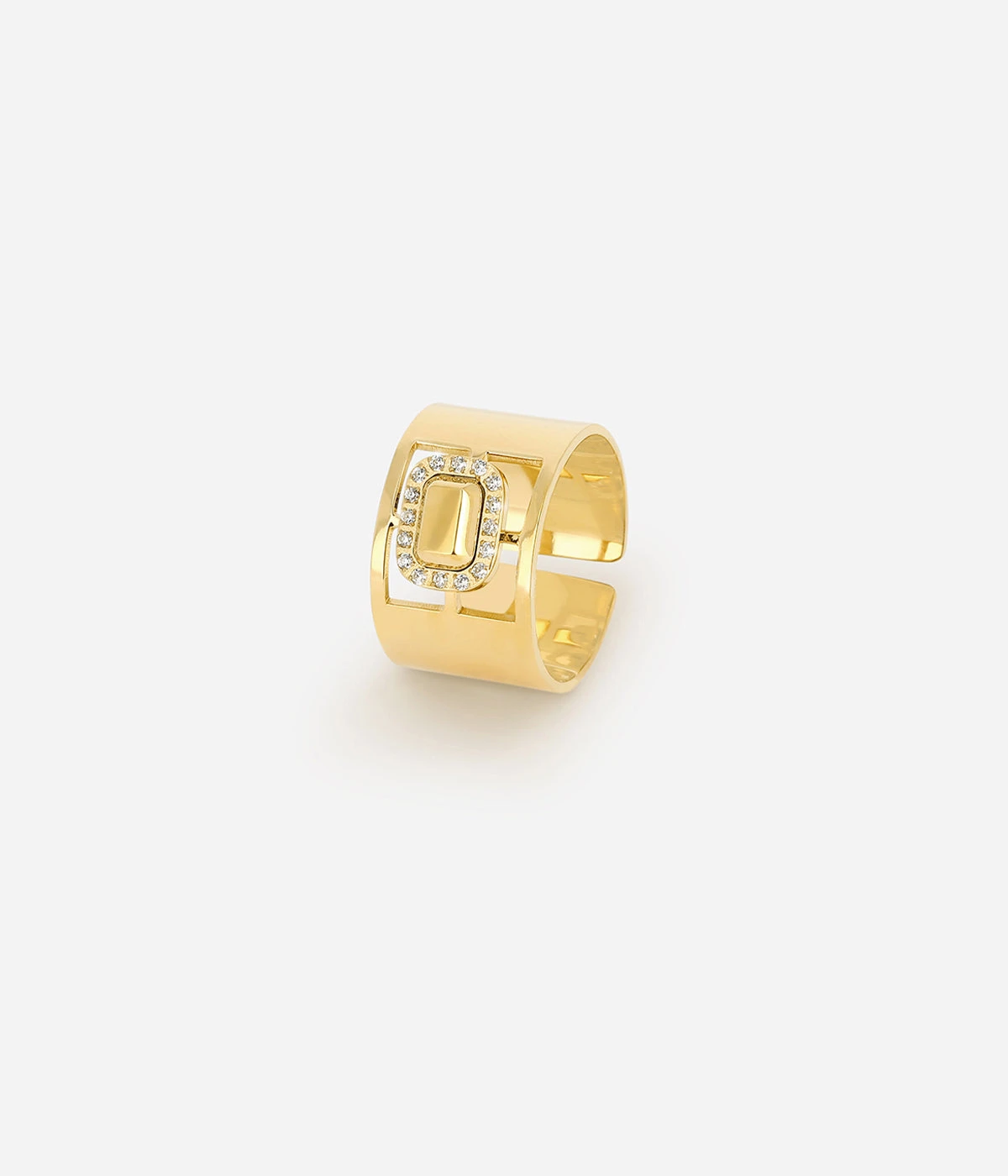 Bague large ajustable en acier uni ou doré à l’or fin avec en son centre une forme rectangulaire sertie de zirconiums.