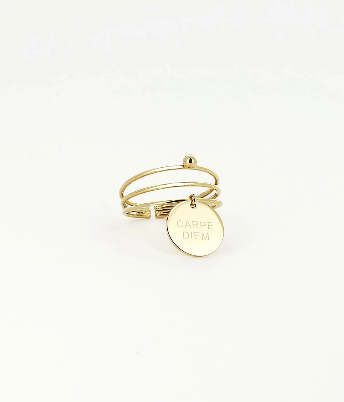 Cette bague est formée de 3 rangs avec le message « Carpe Diem » gravé sur un médaillon.