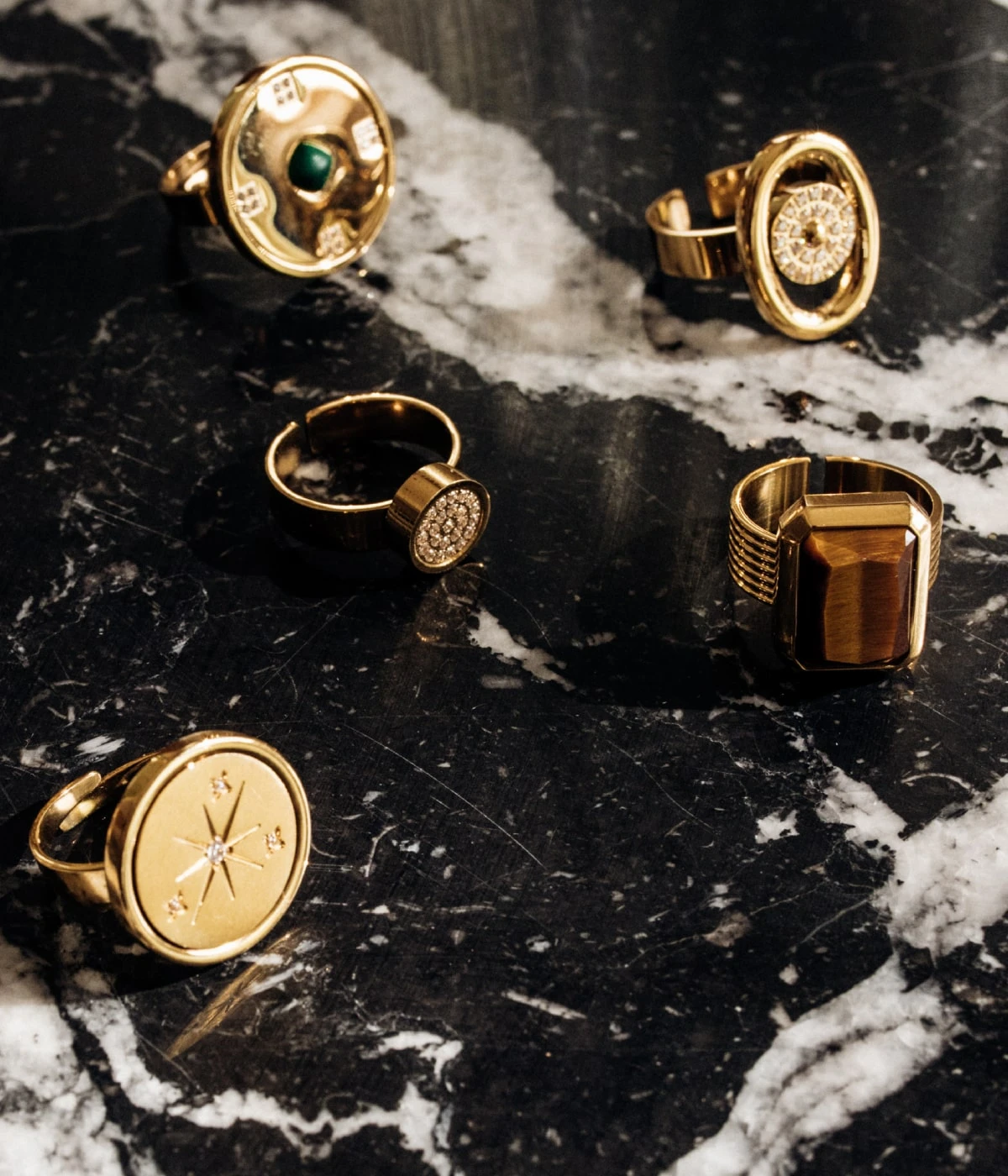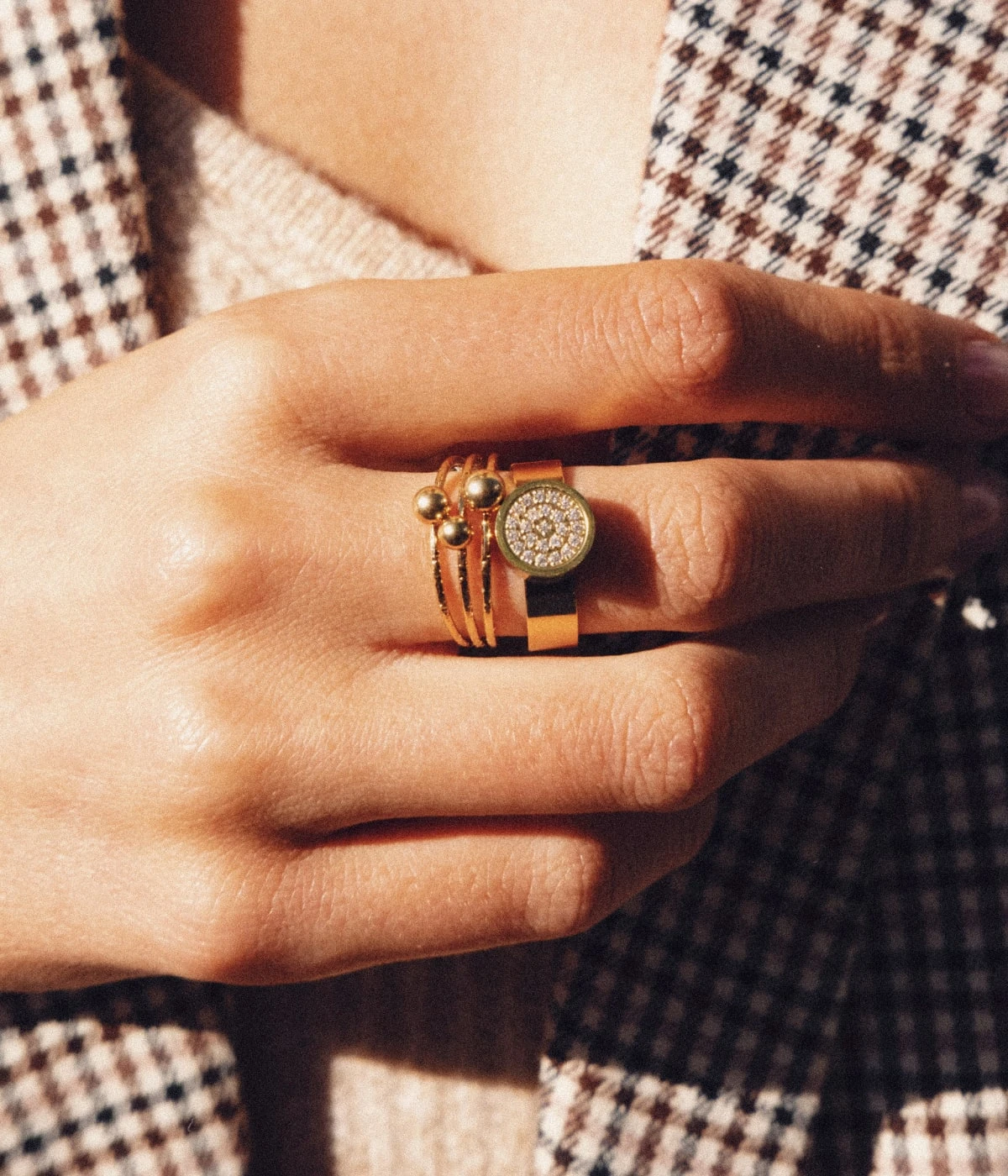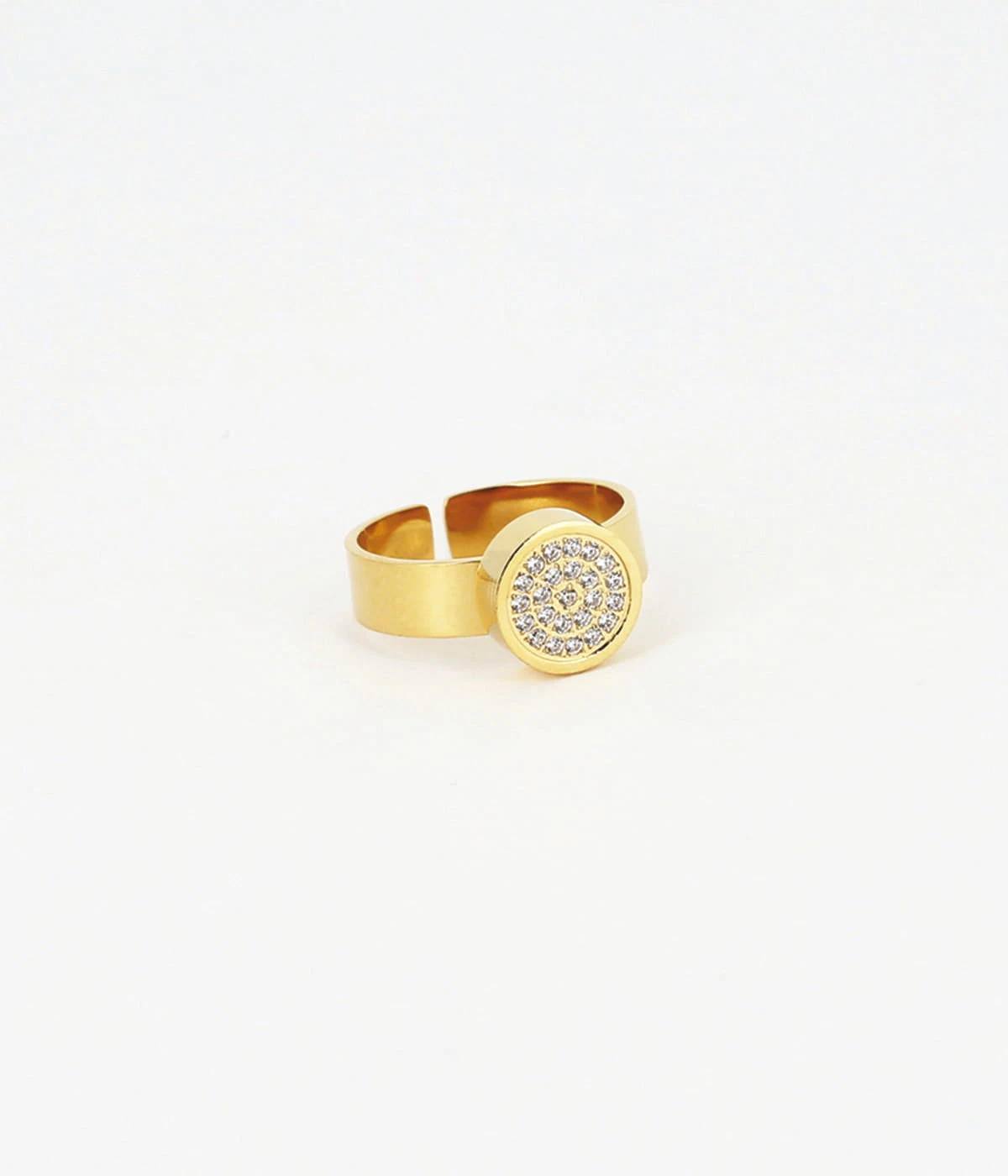 Bague ajustable en acier uni ou doré à l’or fin composée d’un motif circulaire sertis de zirconiums brillants.