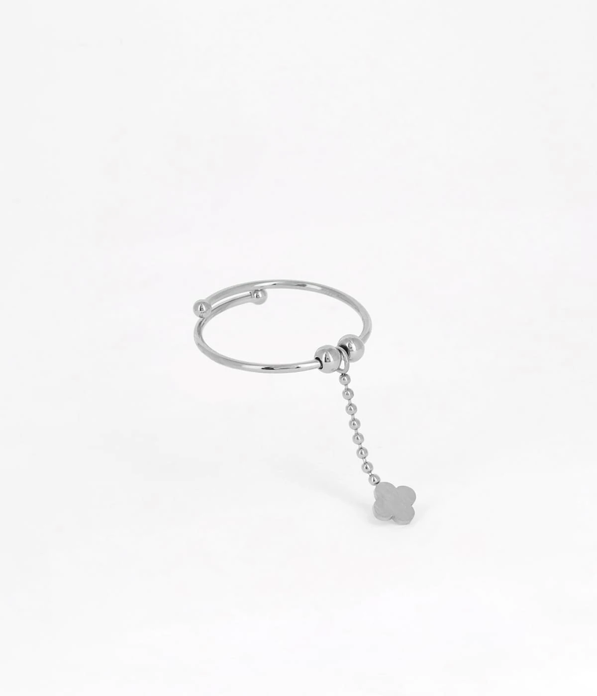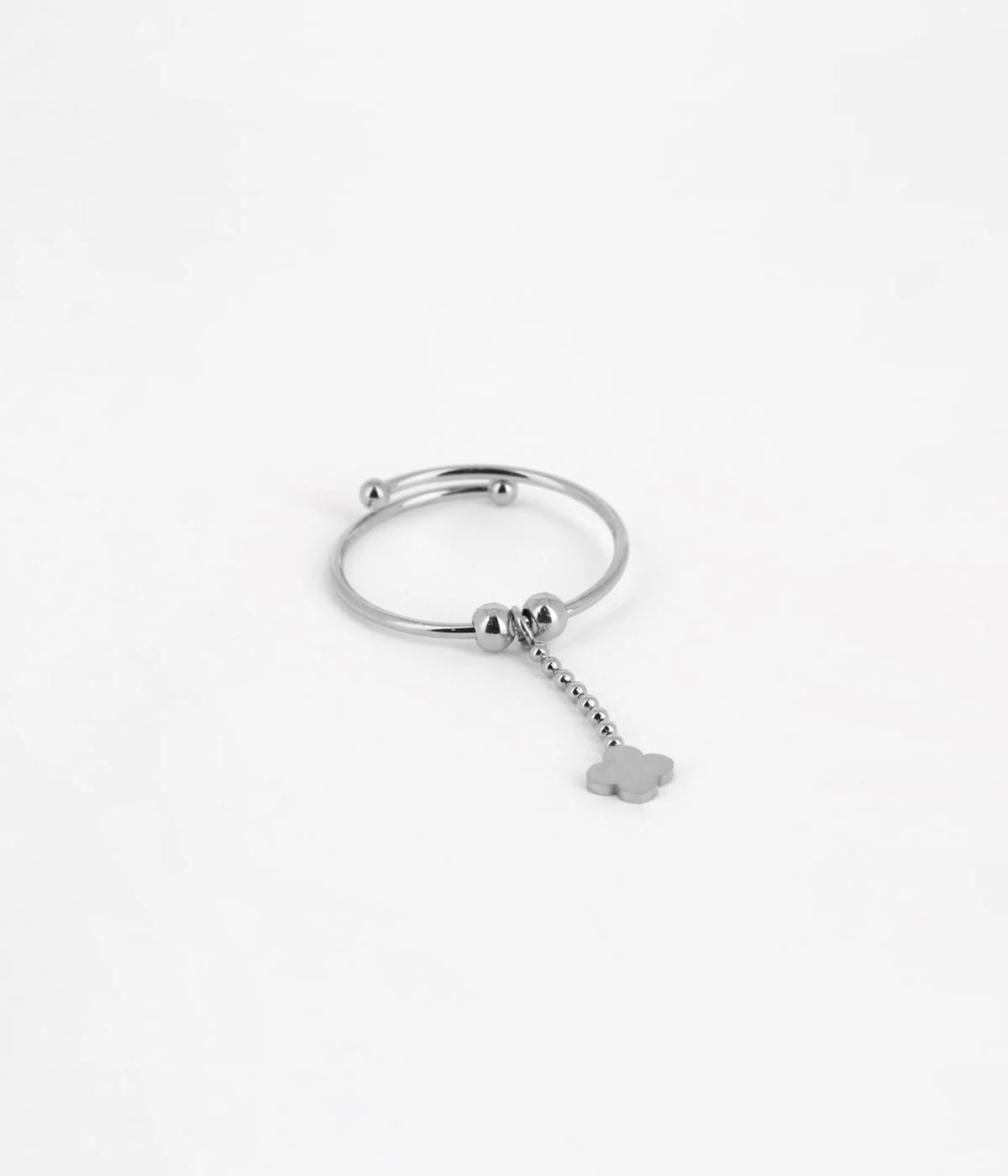 Bague ajustable en acier uni ou doré à l’or fin. Cette bague est sertie de deux petites boules et d’une charmant petit trèfle.