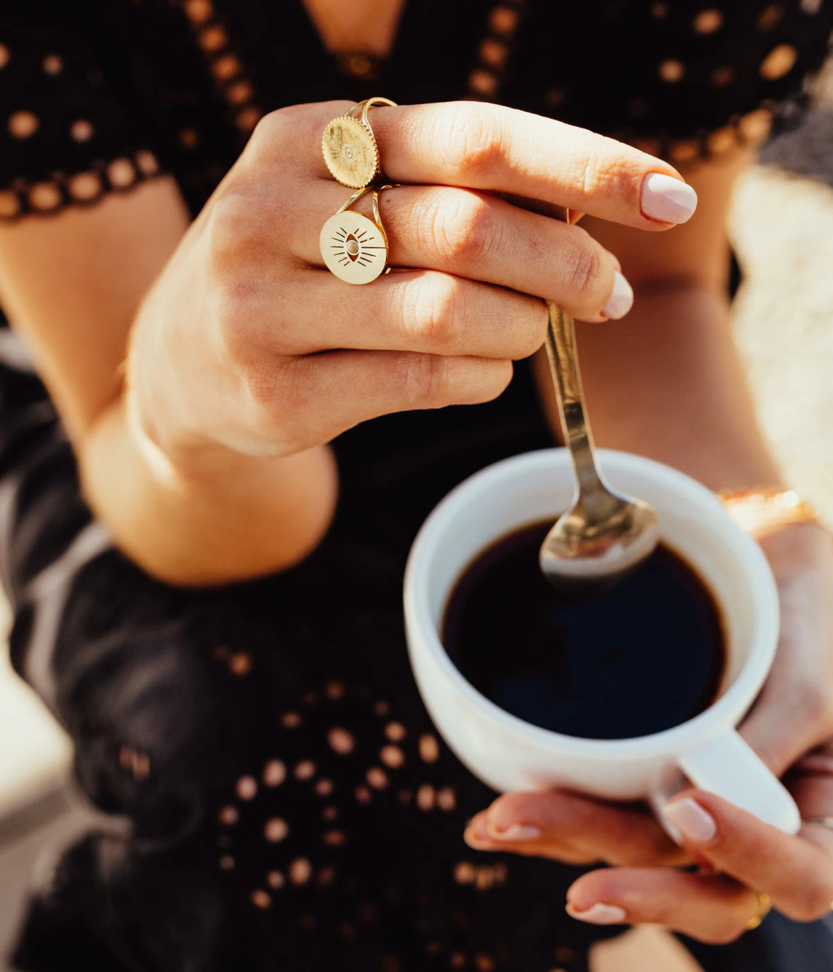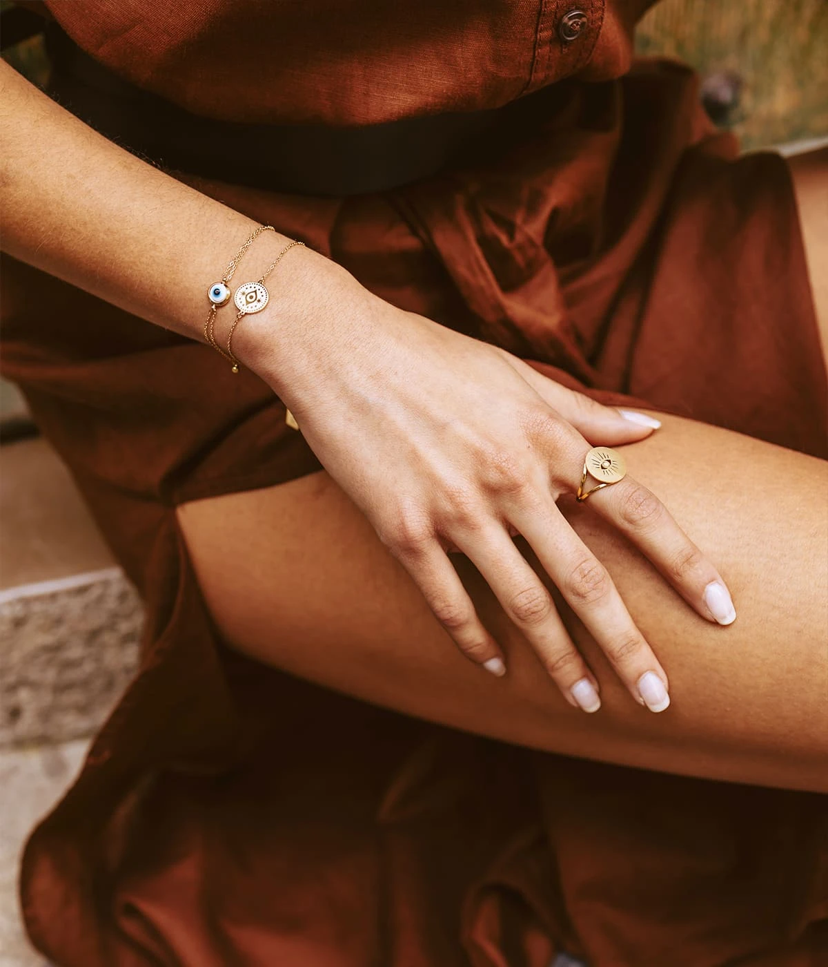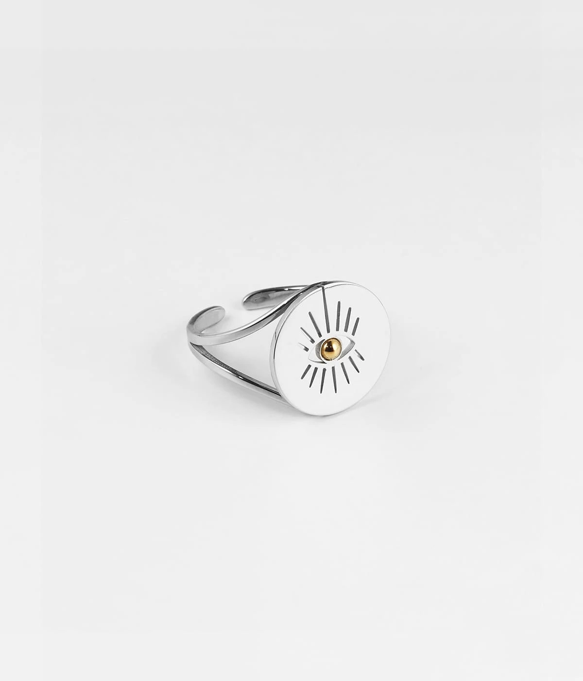 Bague ajustable en acier uni ou doré à l’or fin sur laquelle est gravé un œil protecteur d’inspiration égyptienne.
