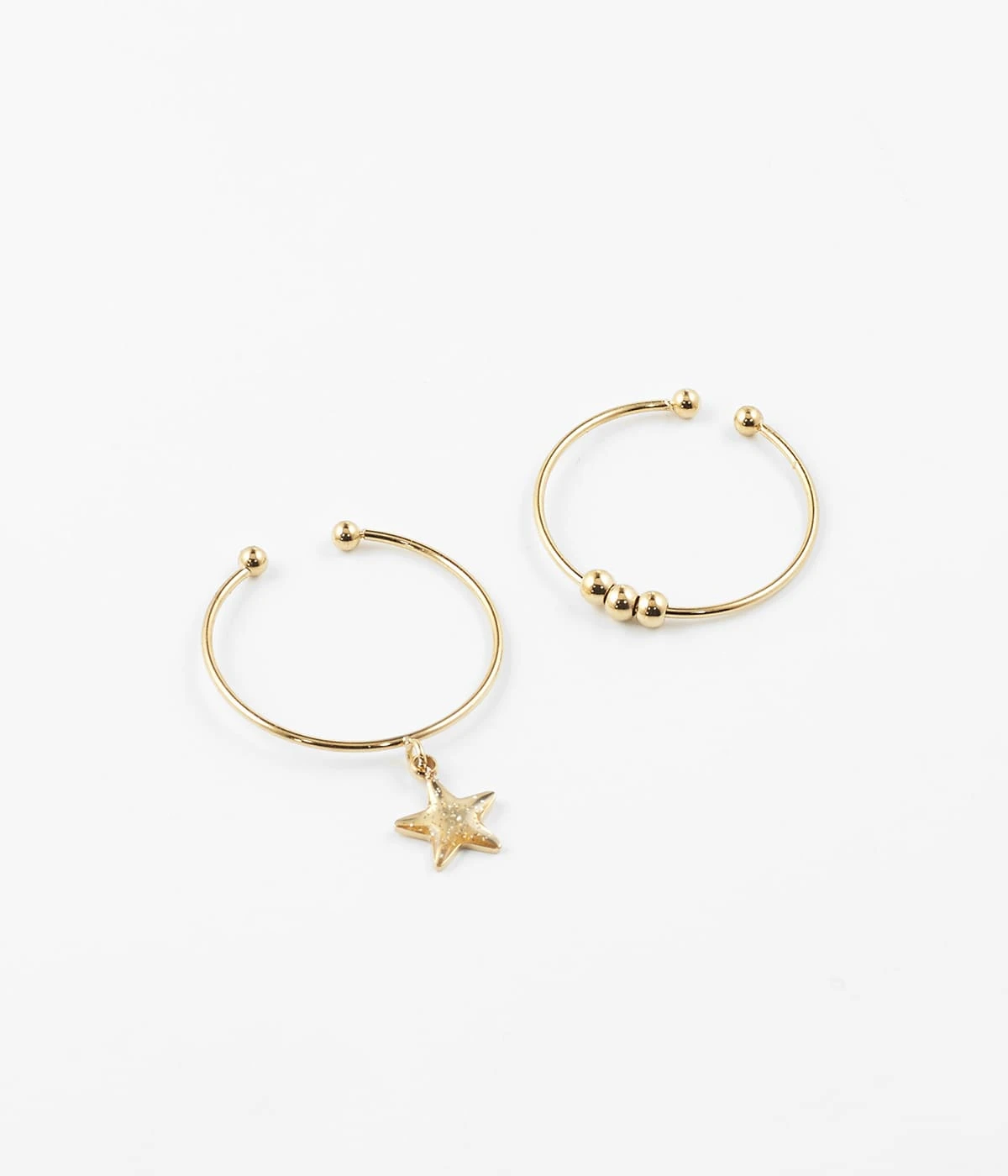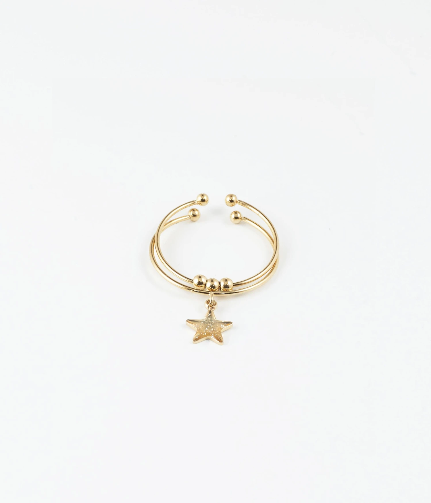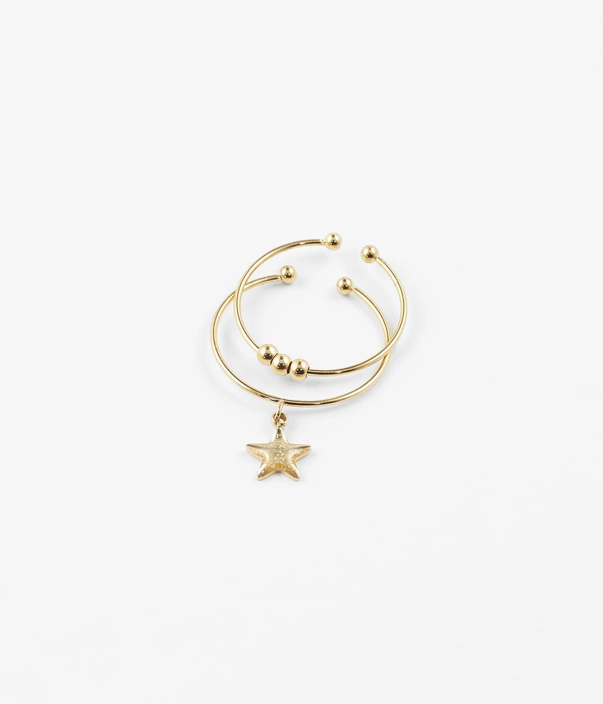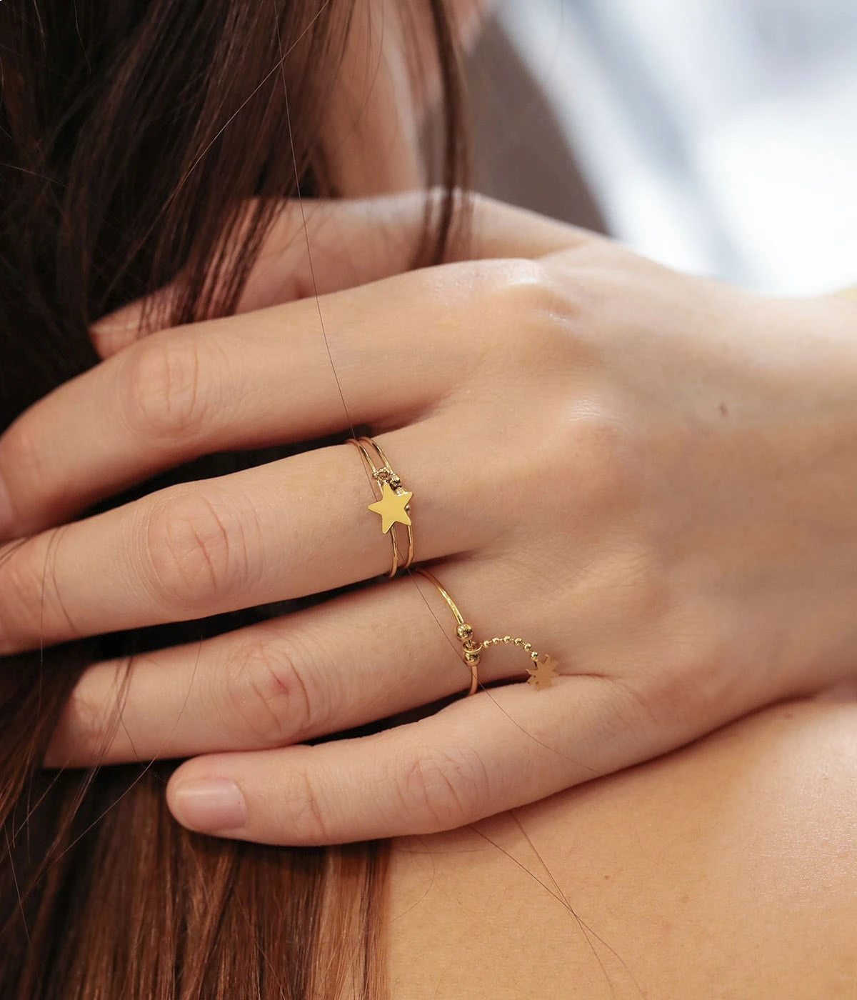 Double anneau ajustable en acier uni et/ou doré à l’or fin. Le premier anneau est parsemé de trois petites perles de métal et le deuxième possède une étoile.