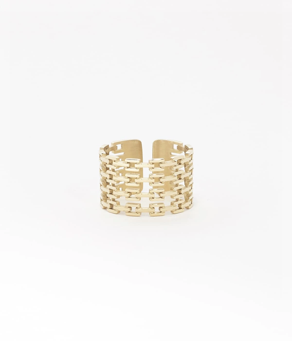 Bague ajustable en acier uni ou doré à l’or fin, composée de maillons rigides.