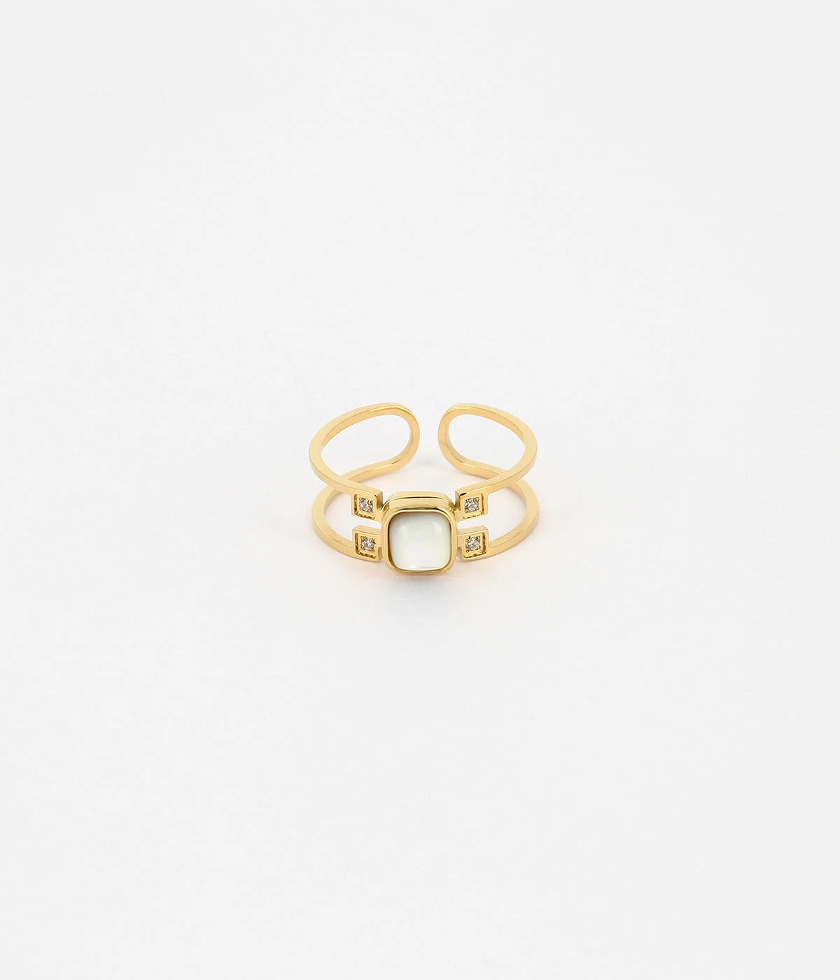 La finesse de cette bague est remarquable. Elle est ornée d’une nacre entourée par quatre petits zirconiums.