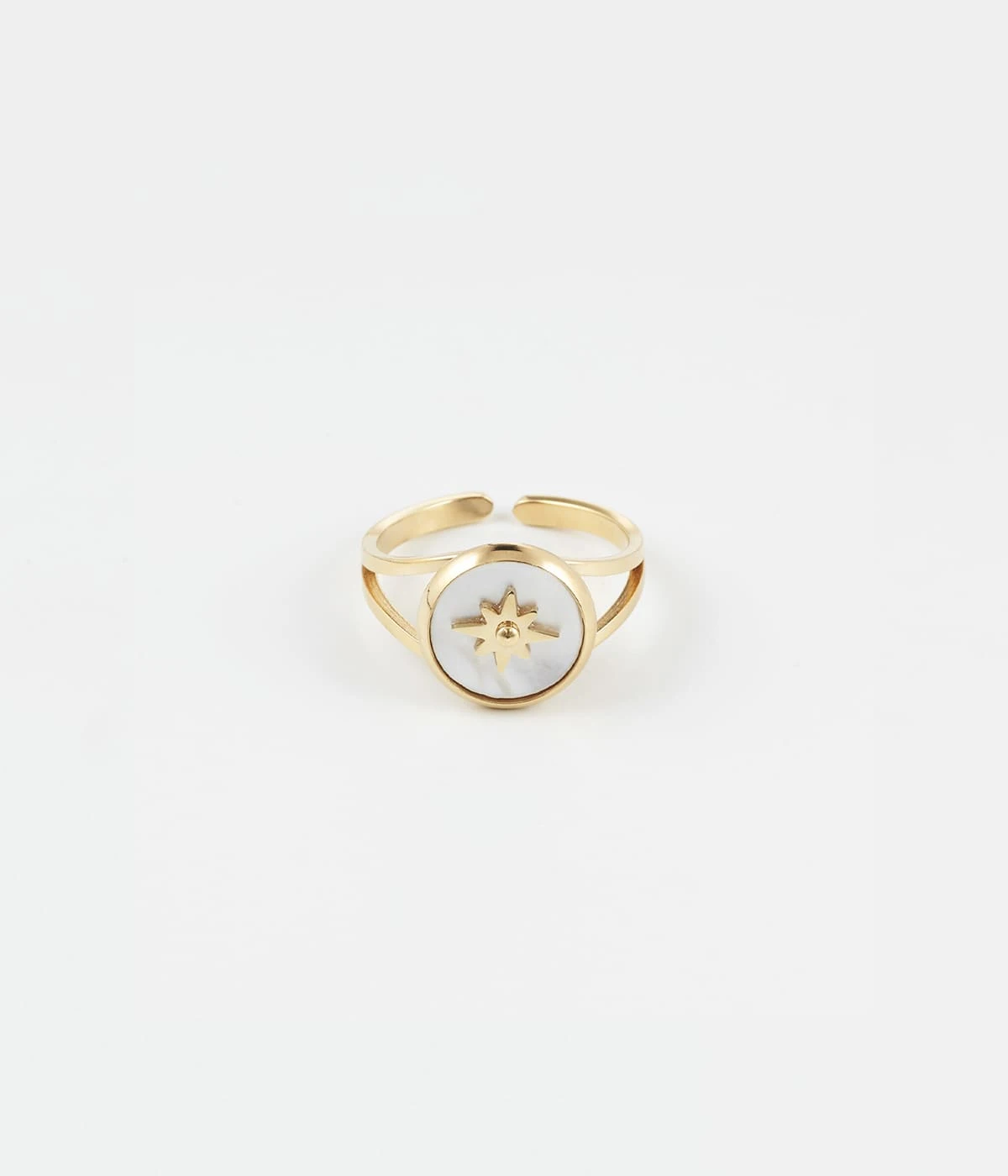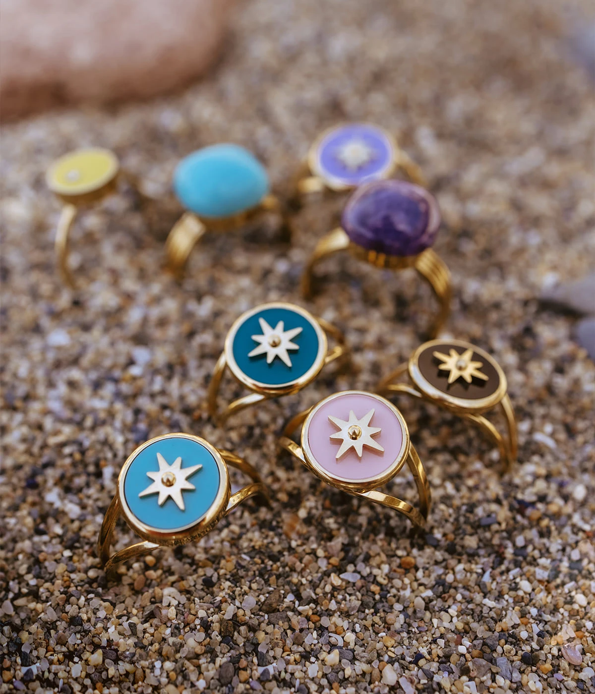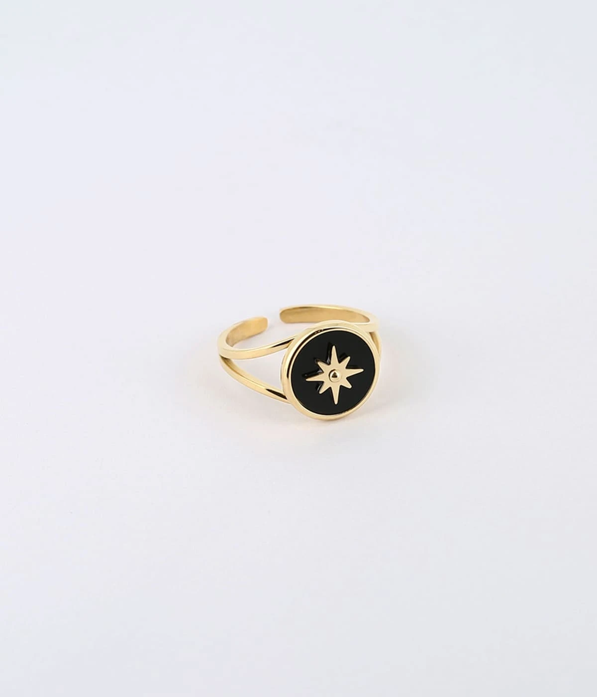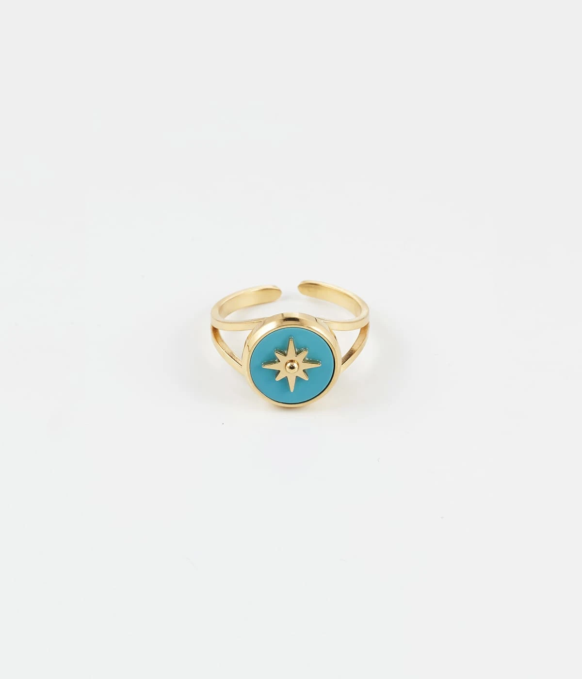 Bague ajustable en acier doré à l’or fin ornée d’une médaille sertie de couleur et piquée d’un soleil doré.