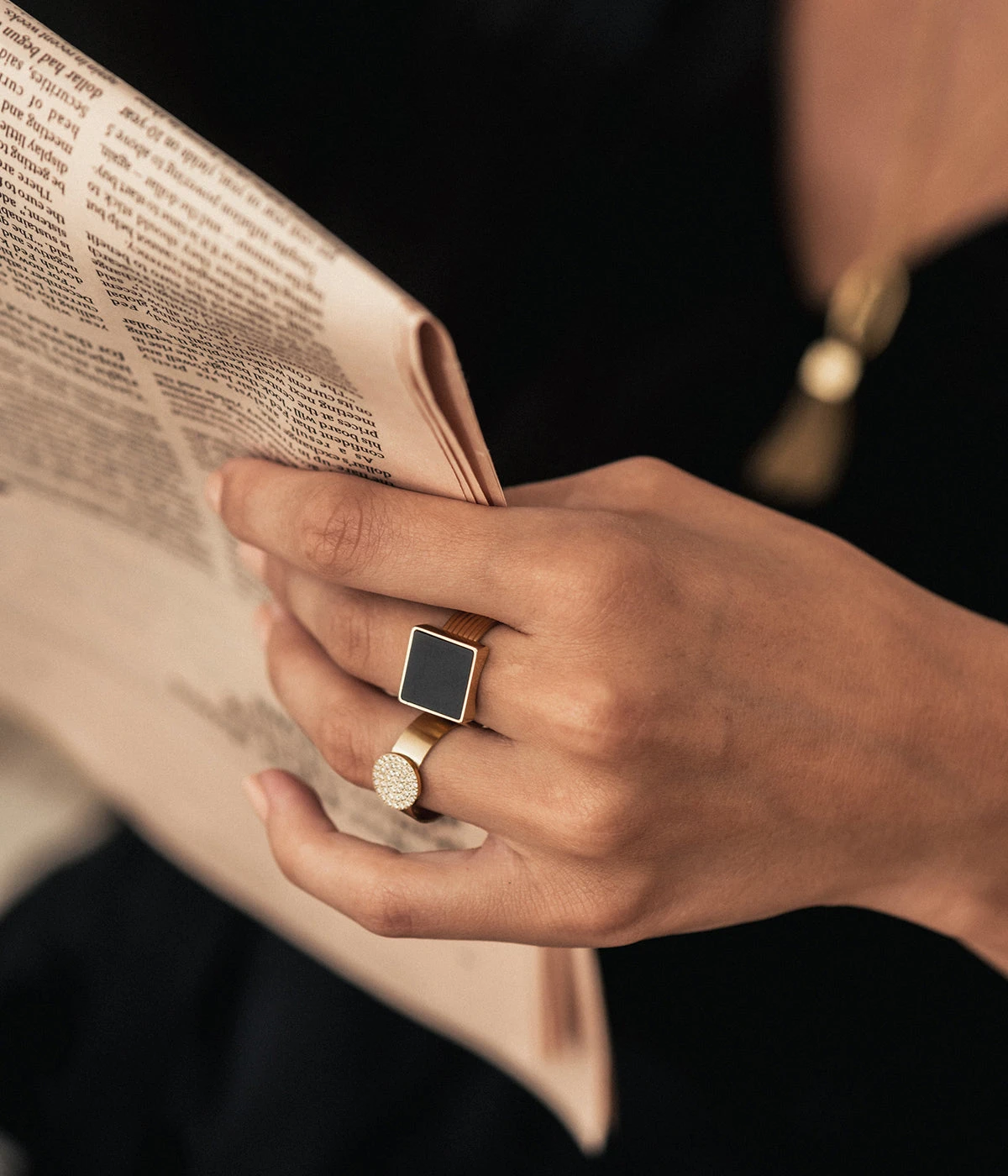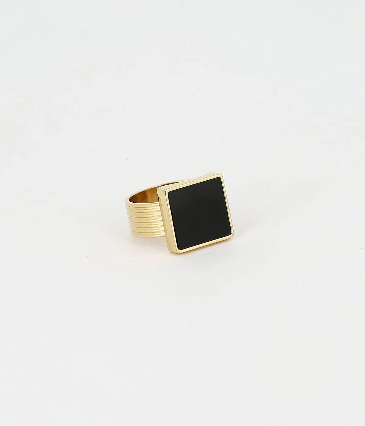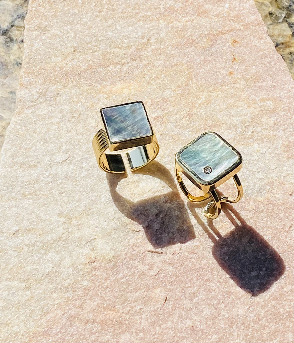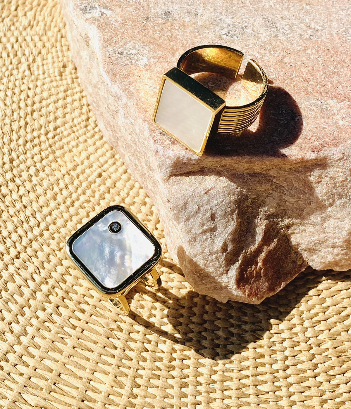 Bague large ajustable en acier doré à l’or fin sur laquelle est attachée un carré coloré.