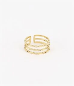 Bague ajustable en acier uni ou doré à l’or fin formée de trois anneaux finement martelés.
