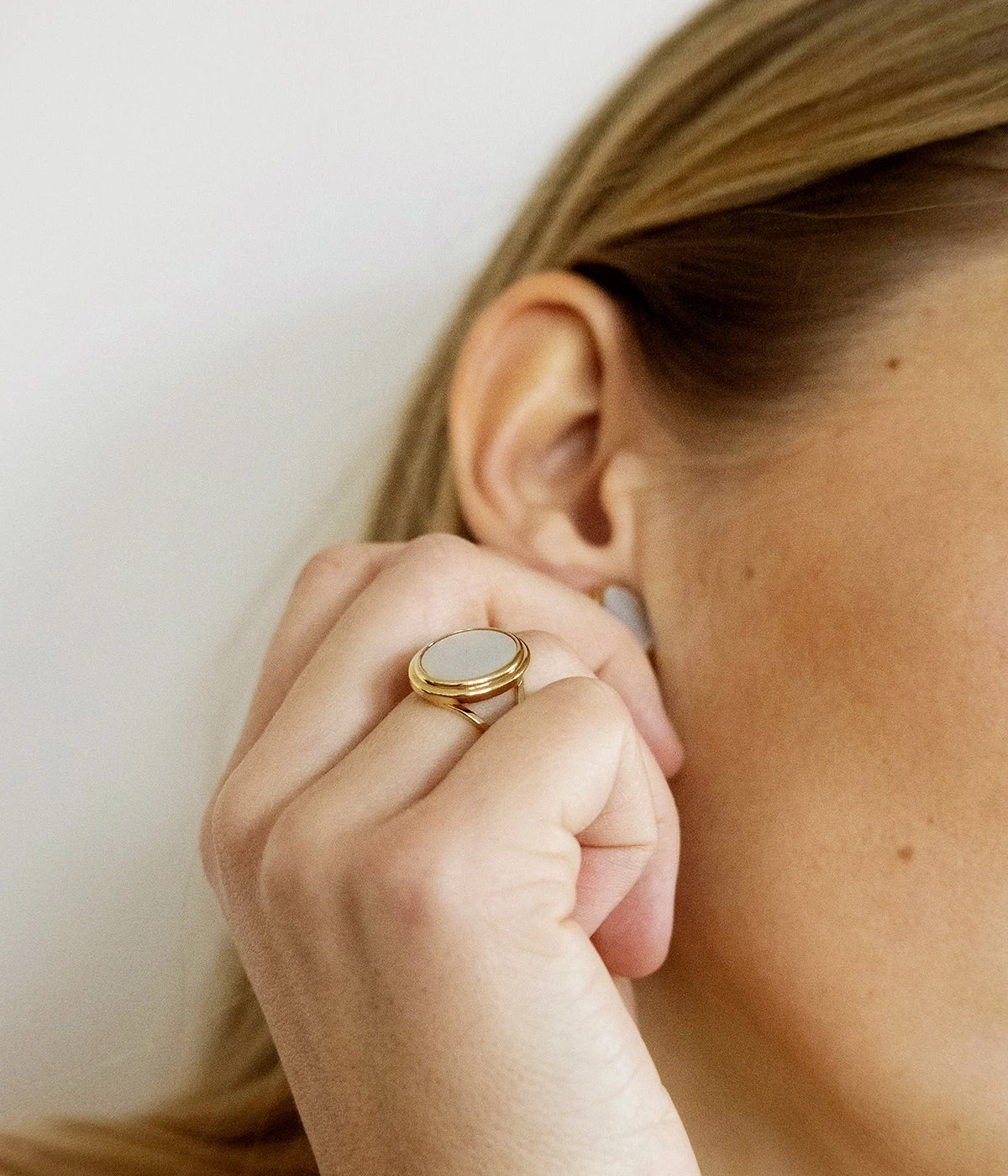 Bague en acier doré à l’or fin avec un cabochon ovale de pierre naturelle.