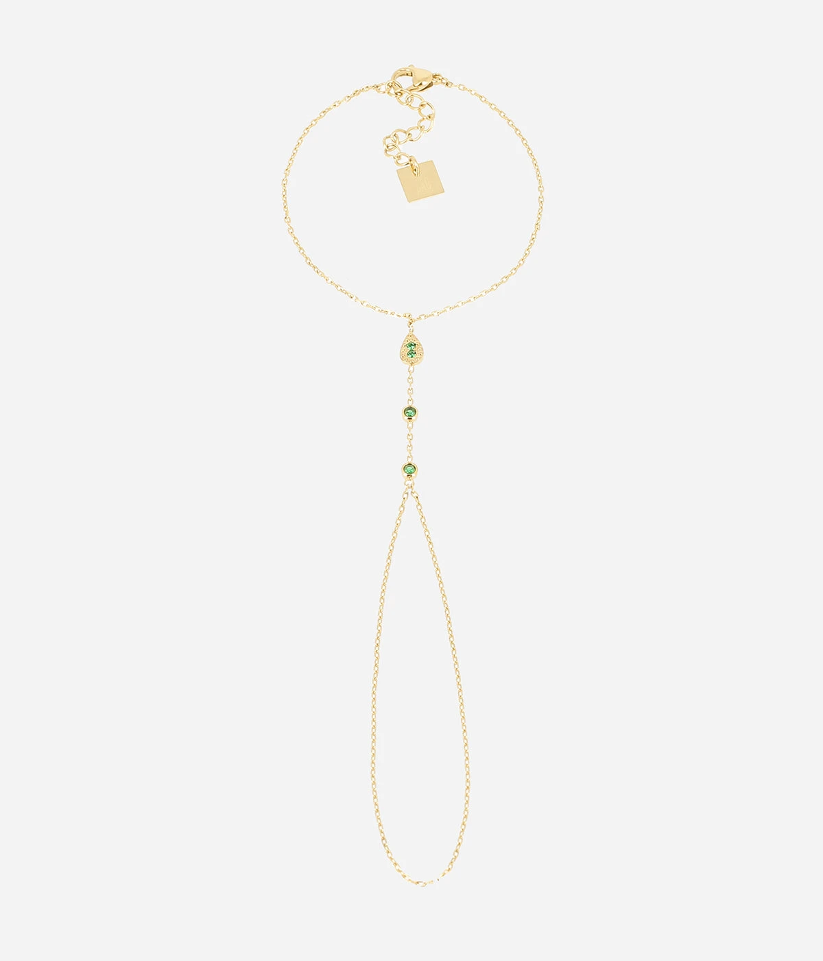 Bijou de main en acier uni ou doré à l’or fin sur lequel se trouvent un motif en forme de poire pavé de zirconiums et deux petits zirconiums.