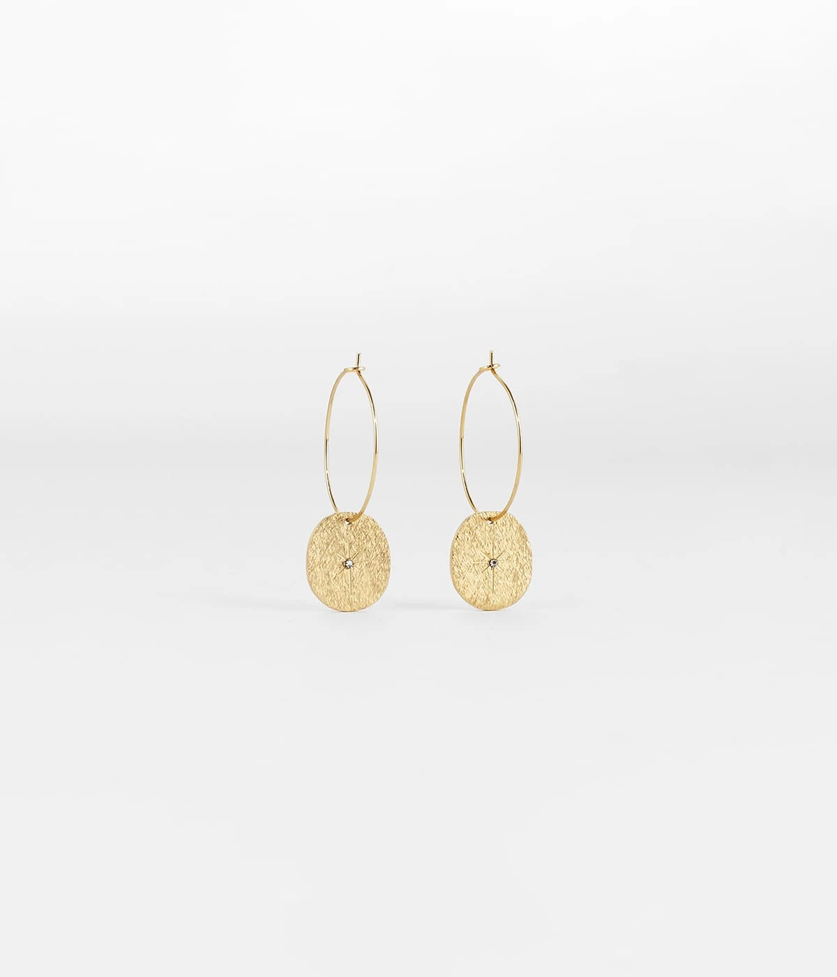 Boucles d’oreilles créoles en acier uni ou doré à l’or fin sur lesquelles sont attachées des pastilles en acier brossé, gravées d’une Étoile du Nord sertie d’un zirconium.