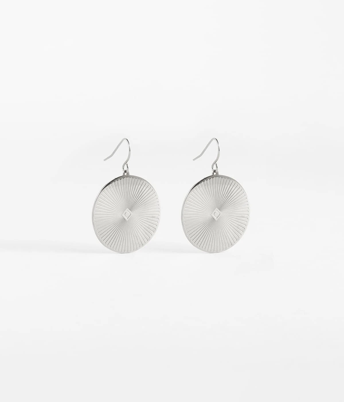 Boucles d’oreilles dormeuses en acier uni ou doré à l’or fin. Est attachée sur chaque dormeuses une pastille de métal gravé de lignes concentriques donnant l’effet de rayons de soleil.