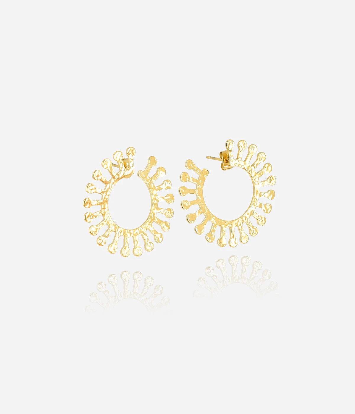Boucles d’oreilles en acier doré à l’or fin représentant un cercle martelé à l’image d’un soleil.