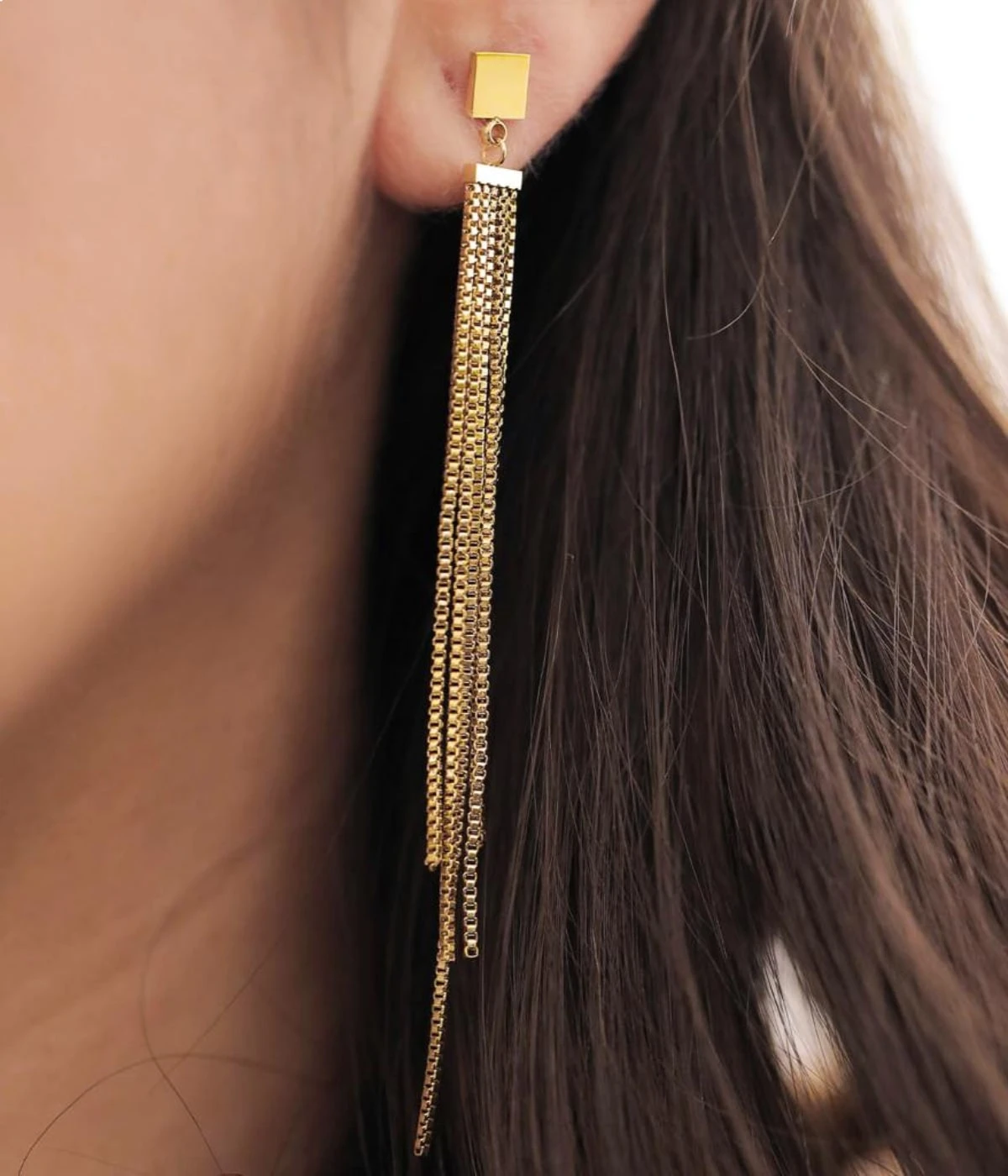 Boucles d’oreilles longues en acier uni ou doré à l’or fin constituées de fines guirlandes de métal.