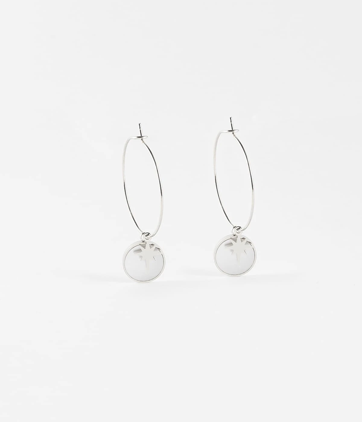 Boucles d’oreilles créoles en acier uni ou doré à l’or fin sur lesquelles sont attachées une médaille de nacre en serti clos et une petite Étoile du Nord.
