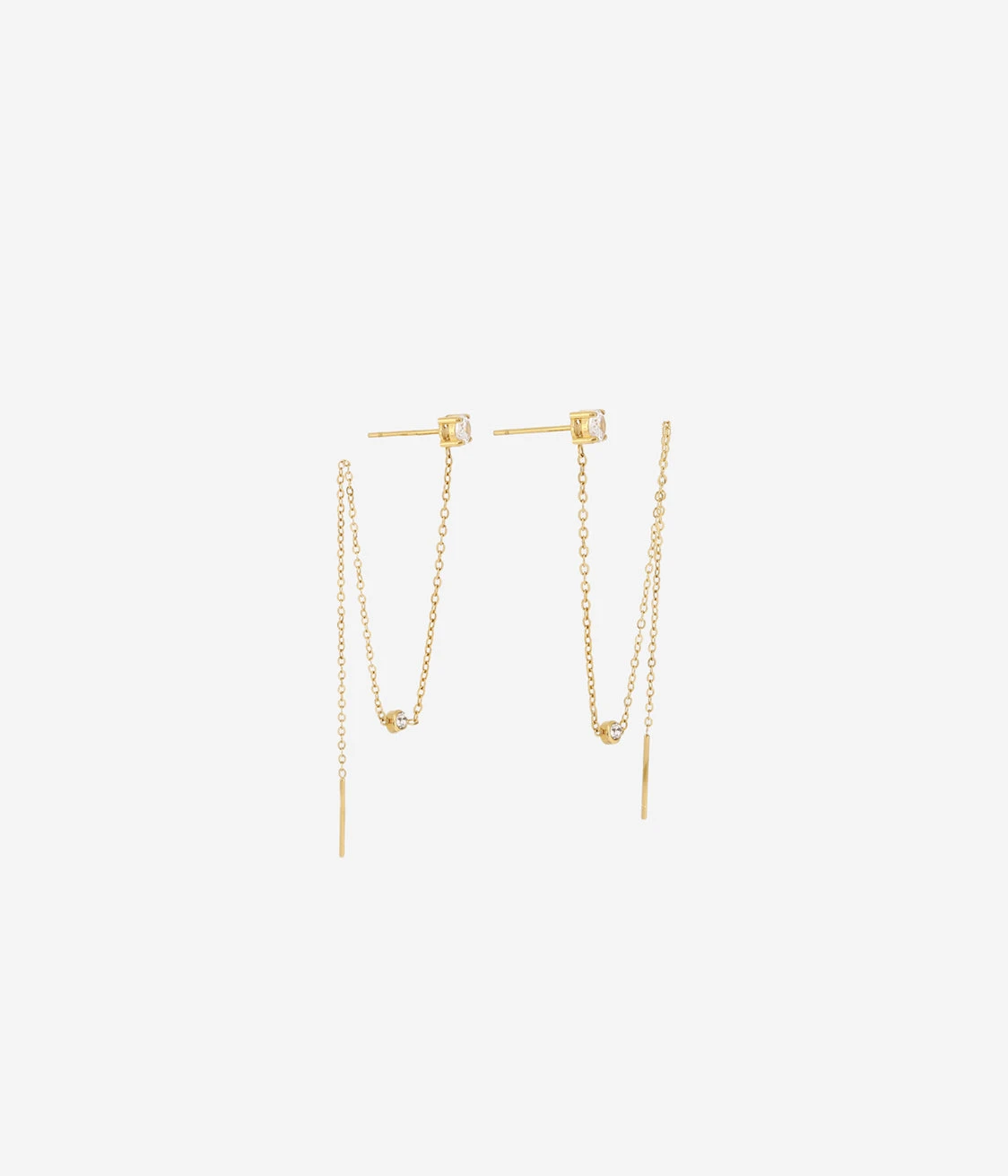 Boucles d’oreilles en acier uni ou doré à l’or fin. À la base se trouve un zirconium qui relie une longue chaînette.