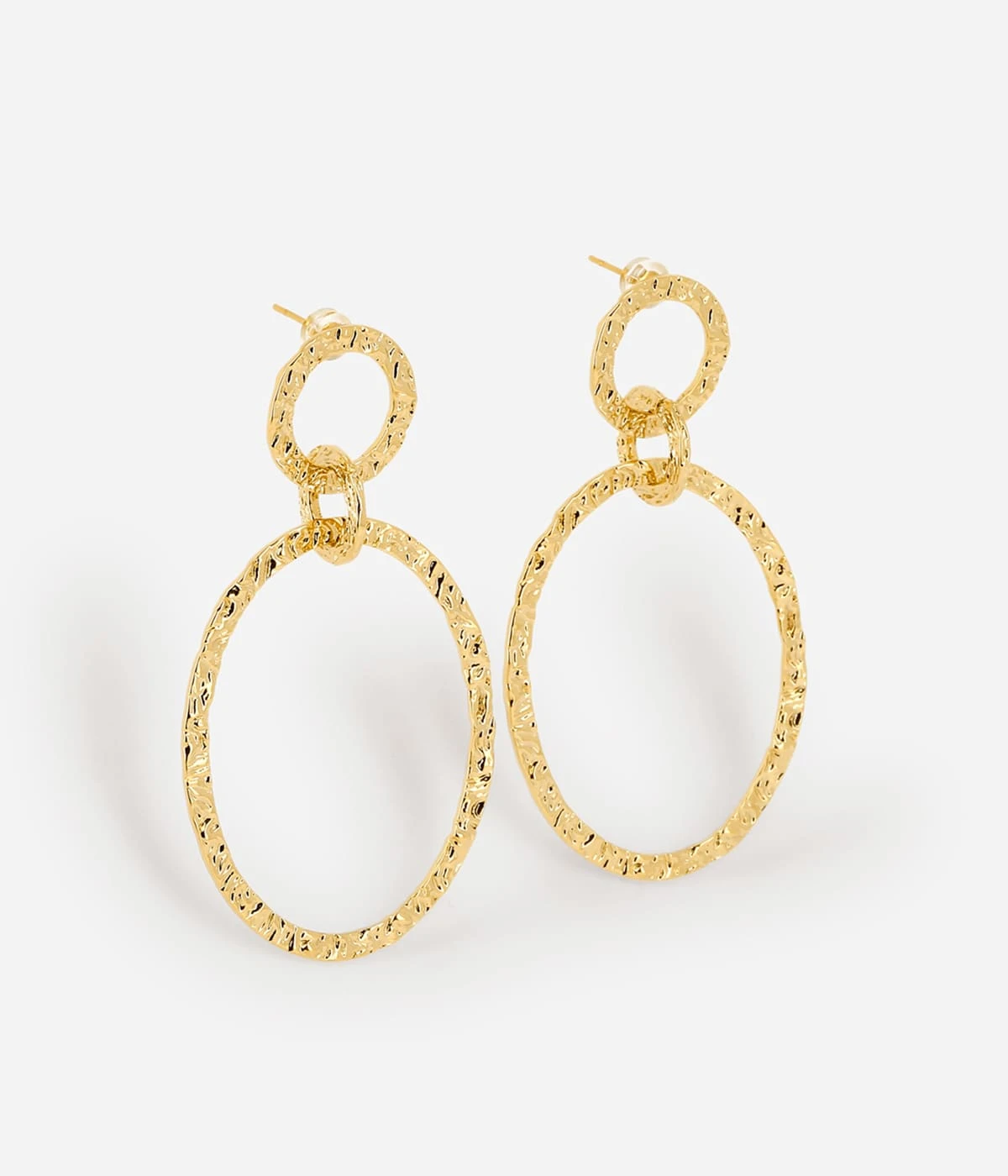 Boucles d’oreilles longues en acier doré à l’or fin. Un grand anneau de métal finement martelés est attaché par deux anneaux plus petits. Ces boucles d’oreilles ont une allure très couture et se portent le jour comme le soir.