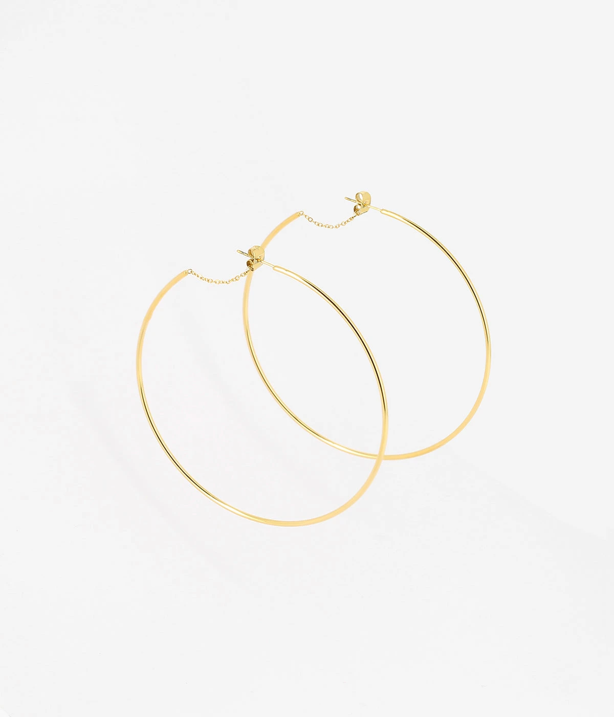 Boucles d’oreilles en acier uni ou doré à l’or fin. Une chaînette relie le bout de la créole au fermoir papillon.