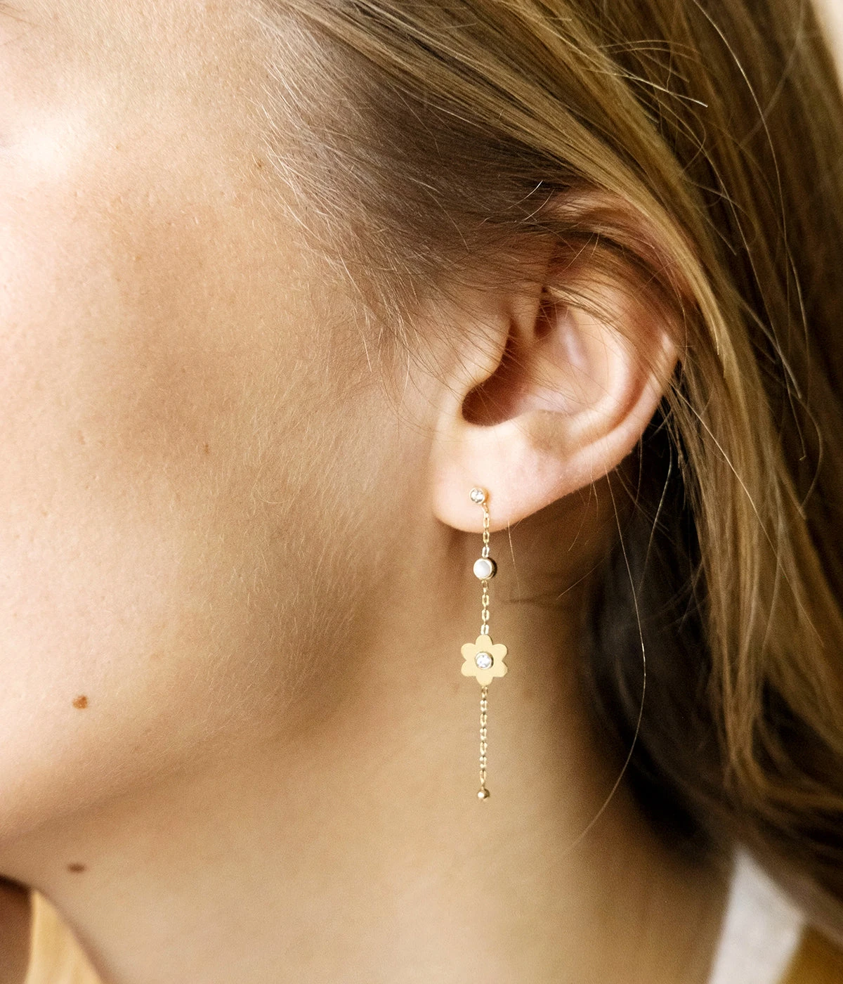Boucles d’oreilles en acier doré à l’or fin faites d’une chaînette sur laquelle se trouvent un zirconium, une pierre colorée et un motif de fleur sertie d’un zirconium.