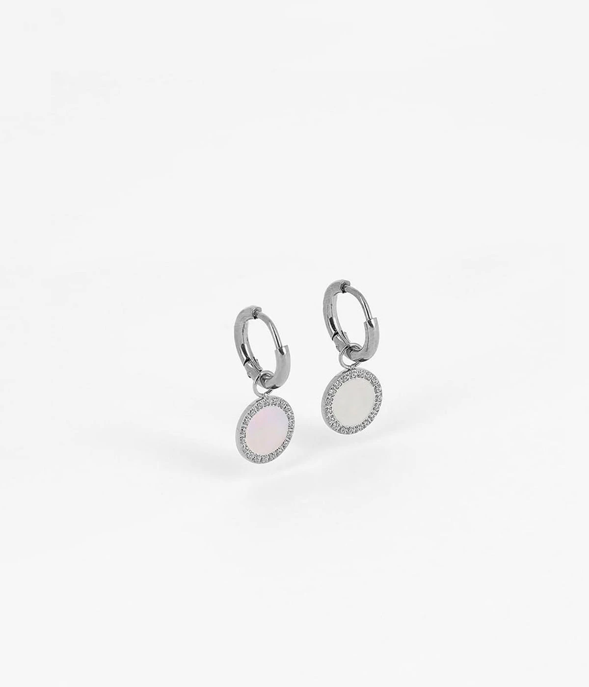 Boucles d’oreilles en acier doré à l’or fin sur lesquelles sont attachées des médailles de nacre blanche ou de bakélite noire, entourées de zirconiums brillants.