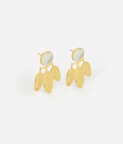 Boucles d’oreilles en acier doré à l’or fin composées de deux pièces séparées. Une première partie, la puce nacré, et une deuxième partie en métal représentant des feuilles de magnolia qui s’enfile derrière la puce.