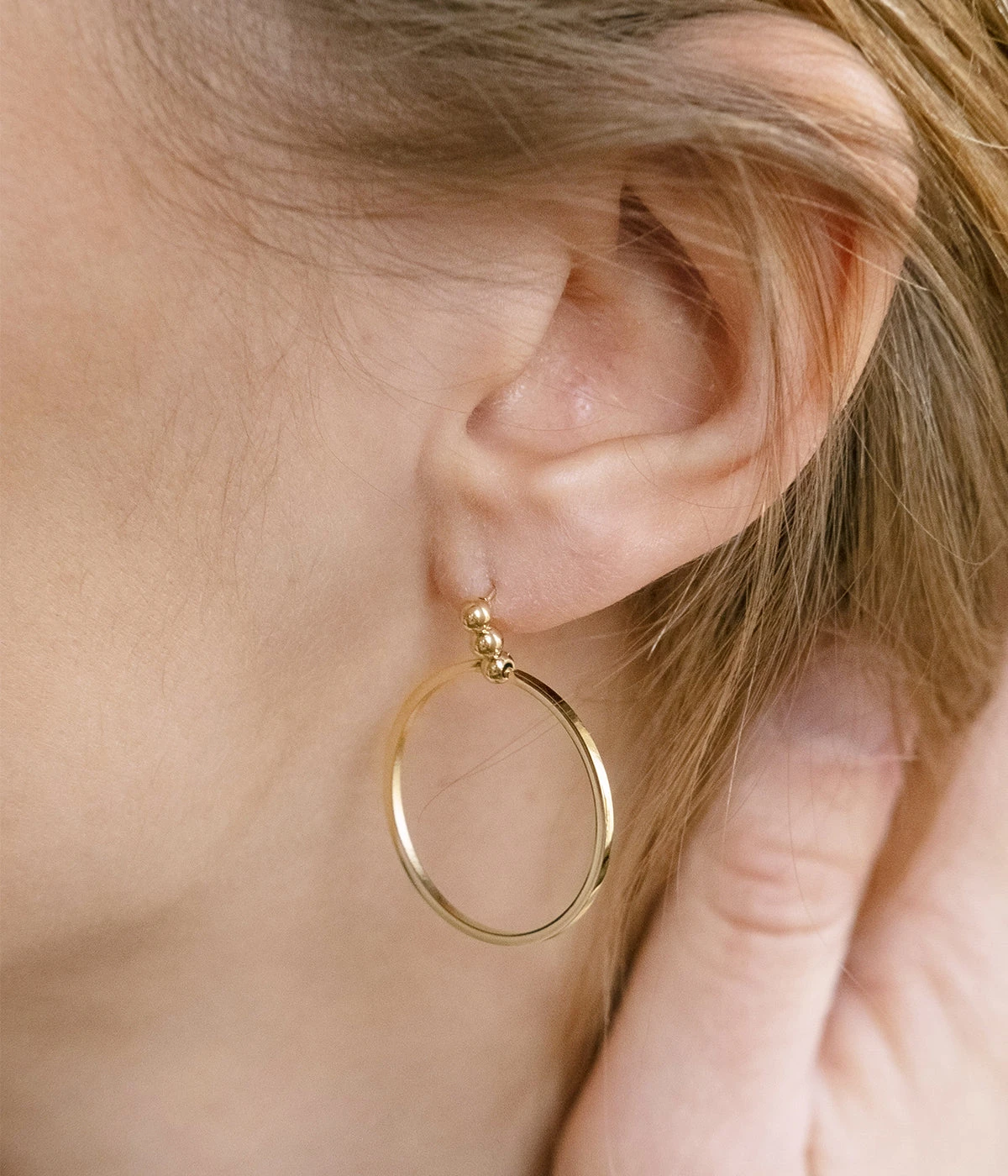 Boucles d’oreilles pendantes en acier uni ou doré à l’or fin composées d’un cercle en métal.