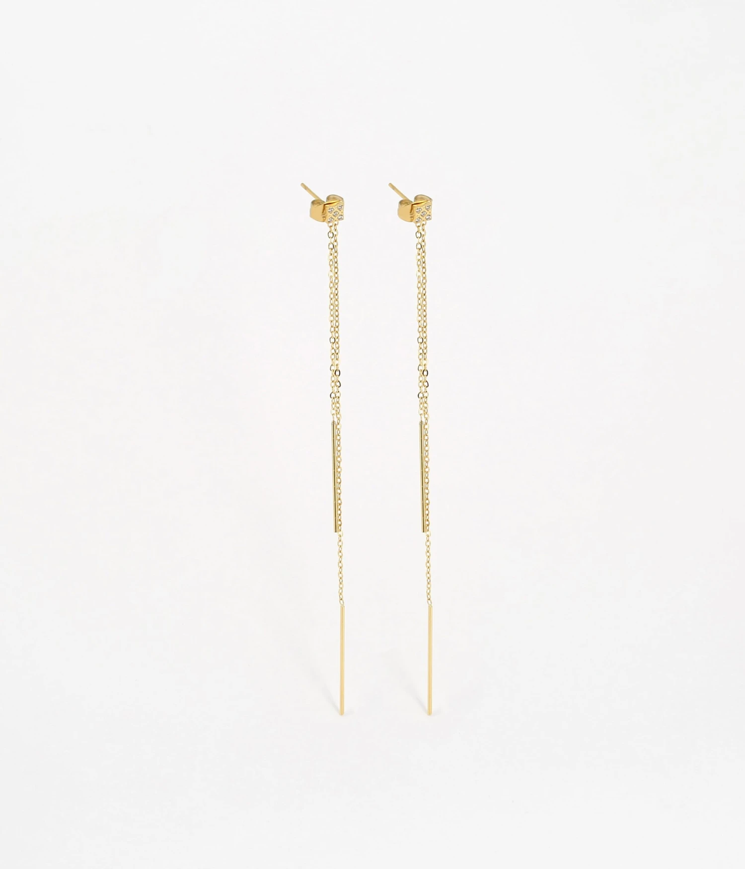 Boucles d’oreilles formées de longues chaînes en acier doré à l’or fin sur lesquelles sont attachées des fins bouts de métal.