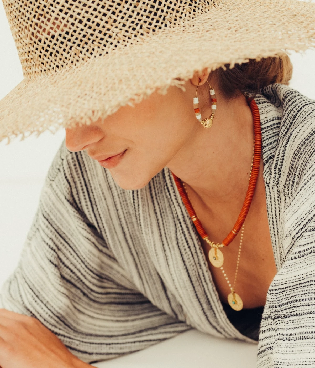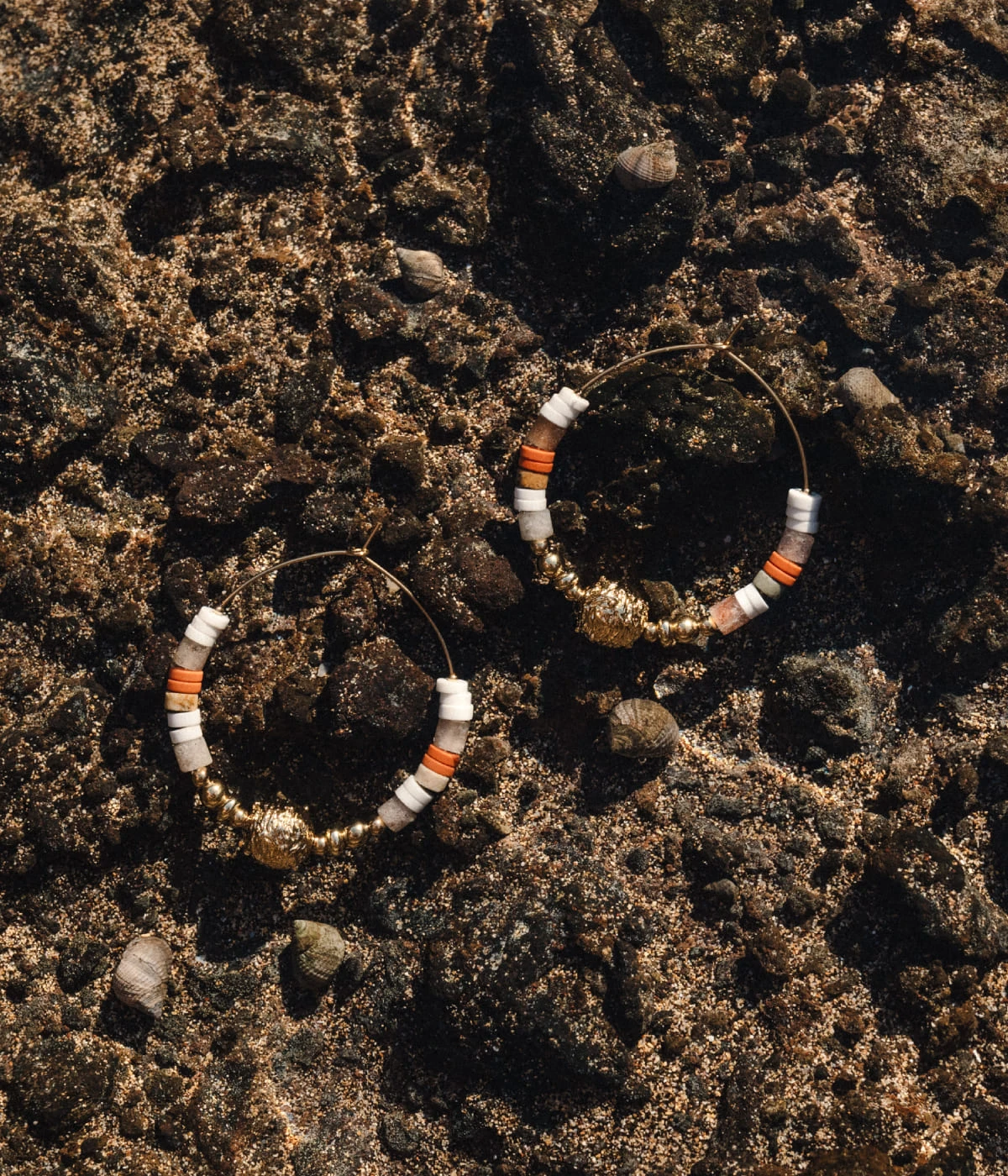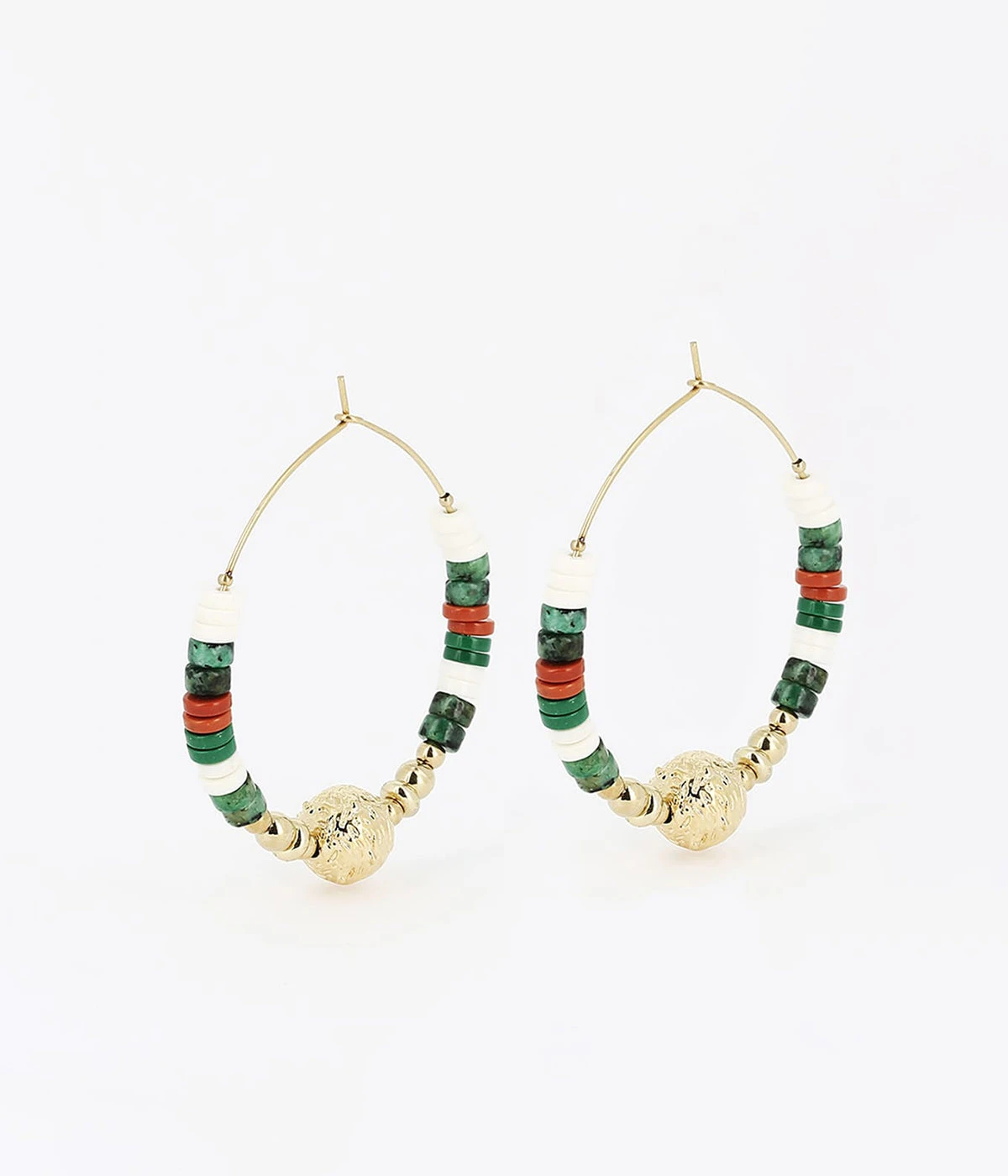 Boucles d’oreilles créoles en acier doré à l’or fin sur lesquelles sont enfilées des rondelles de coquillages blancs et de pierres fines.
