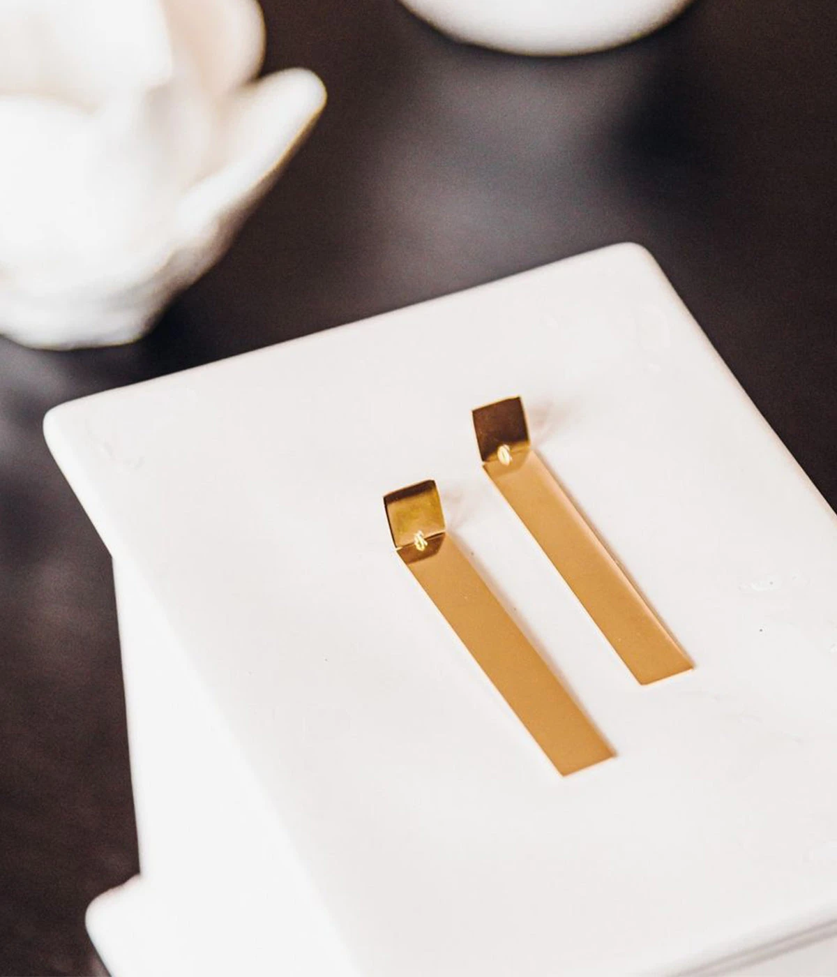 Boucles d’oreilles longues en acier uni ou doré à l’or fin de forme géométrique.