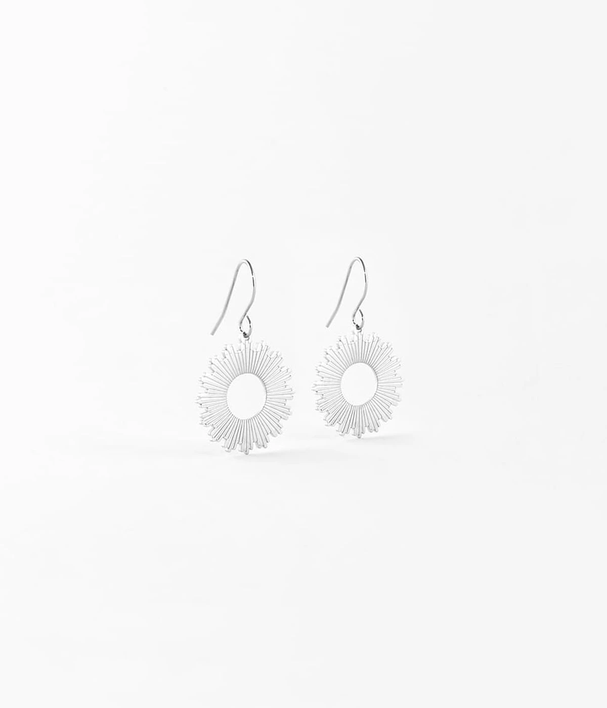 Boucles d’oreilles dormeuses en acier uni ou doré à l’or fin décorées d’un motif représentant un soleil redéfini.