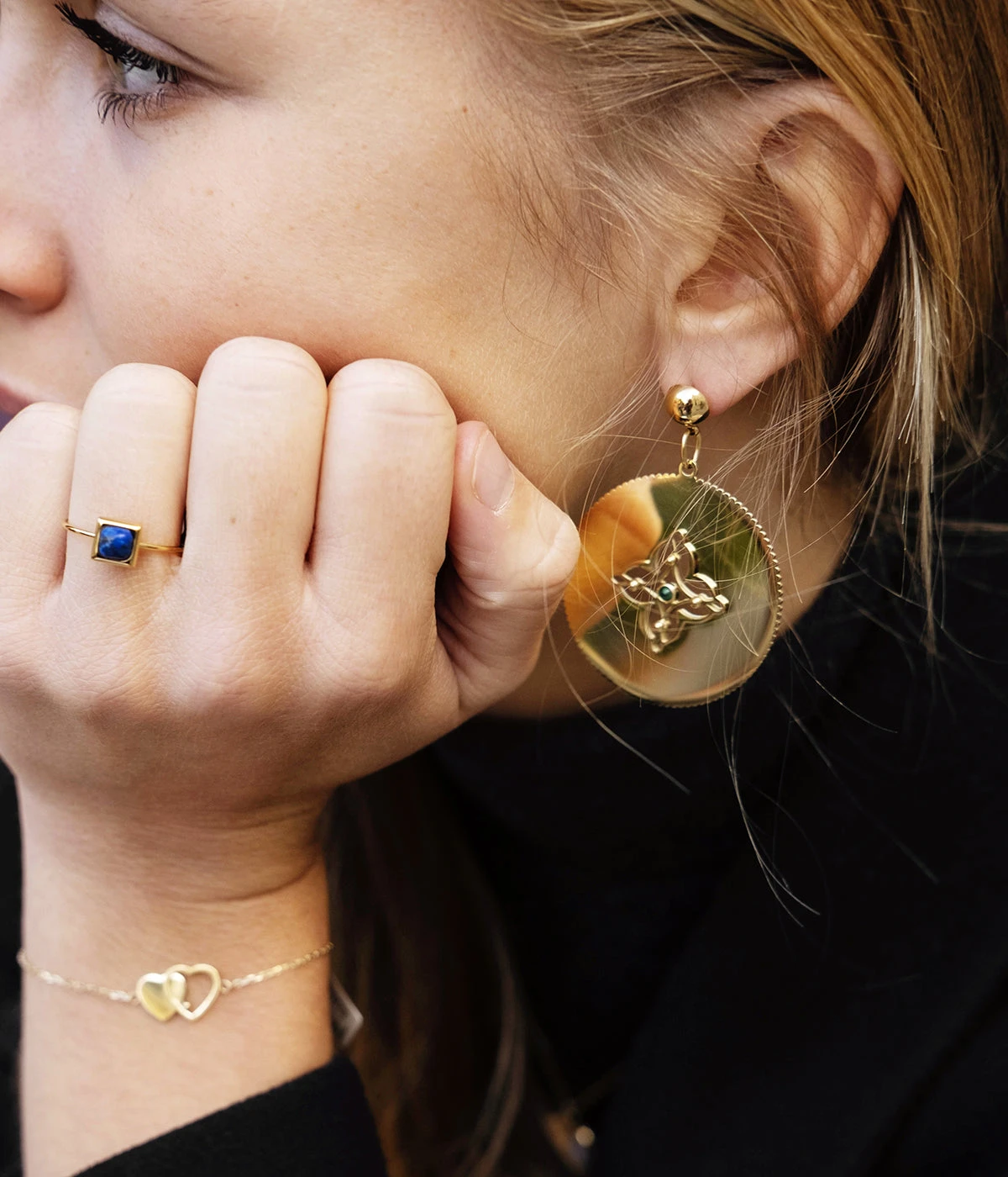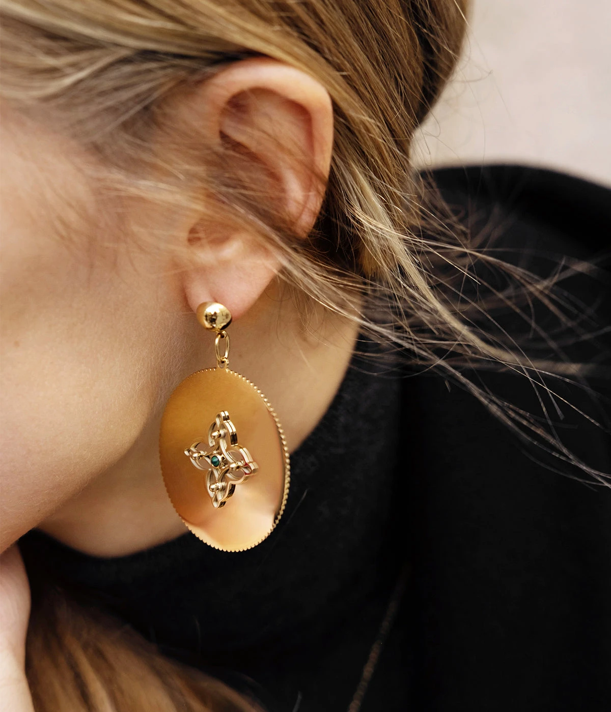 Boucles d’oreilles en acier doré à l’or fin avec un motif de fleur et une pierre de malachite en son centre.