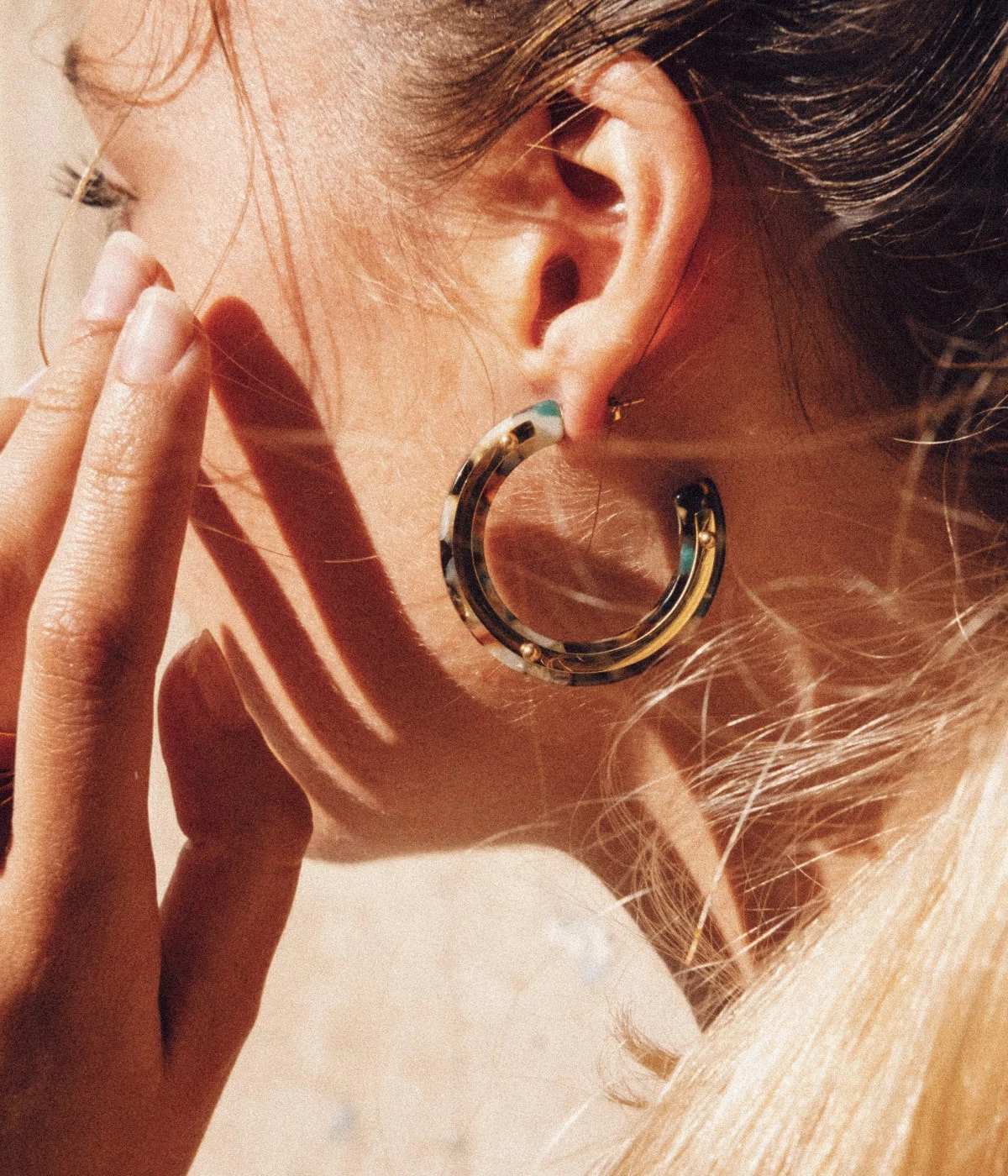 Boucles d’oreilles en acier doré à l’or fin et acétate colorée. Ces boucles sont couvertes sur leur tranche d’une bande de métal doré.