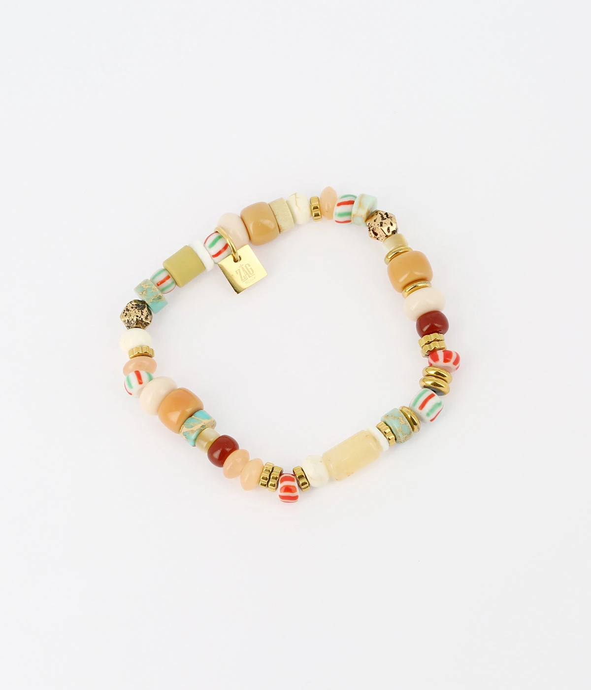 Les pierres sont mélangées formant des rayures multicolores sur le poignet.