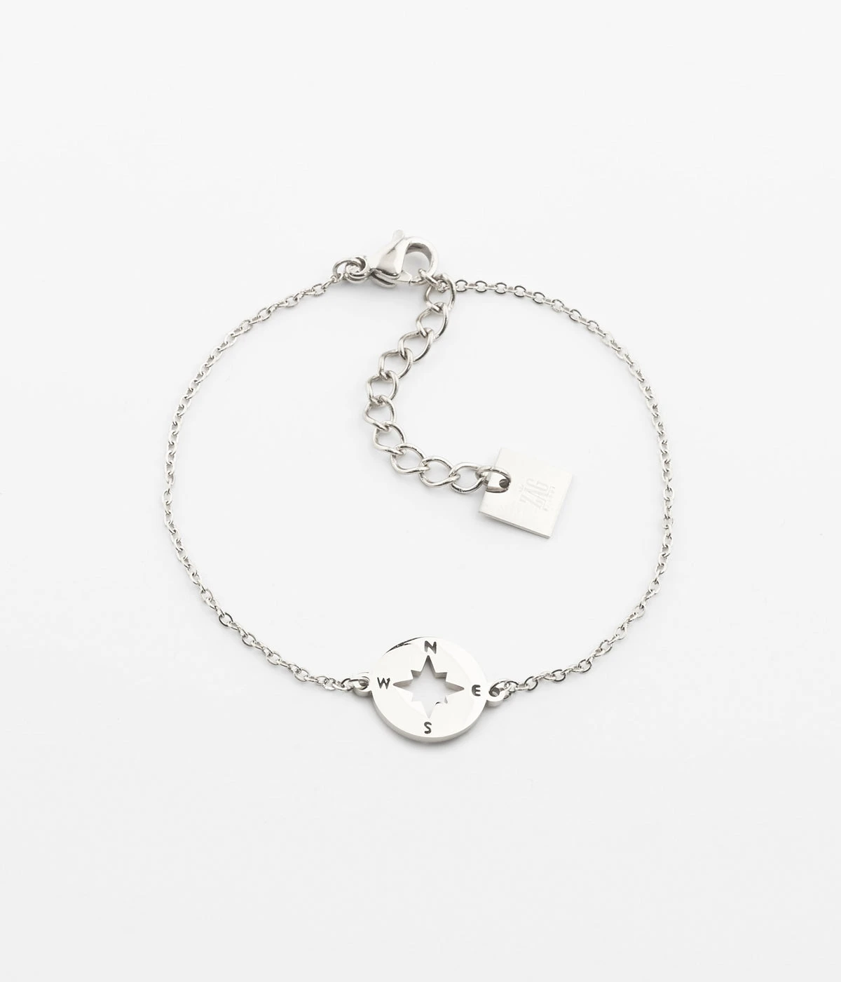 Collier en acier uni ou doré à l’or fin. La chaînette passe délicatement au milieu d’une médaille finement ciselée rappelant les points cardinaux.