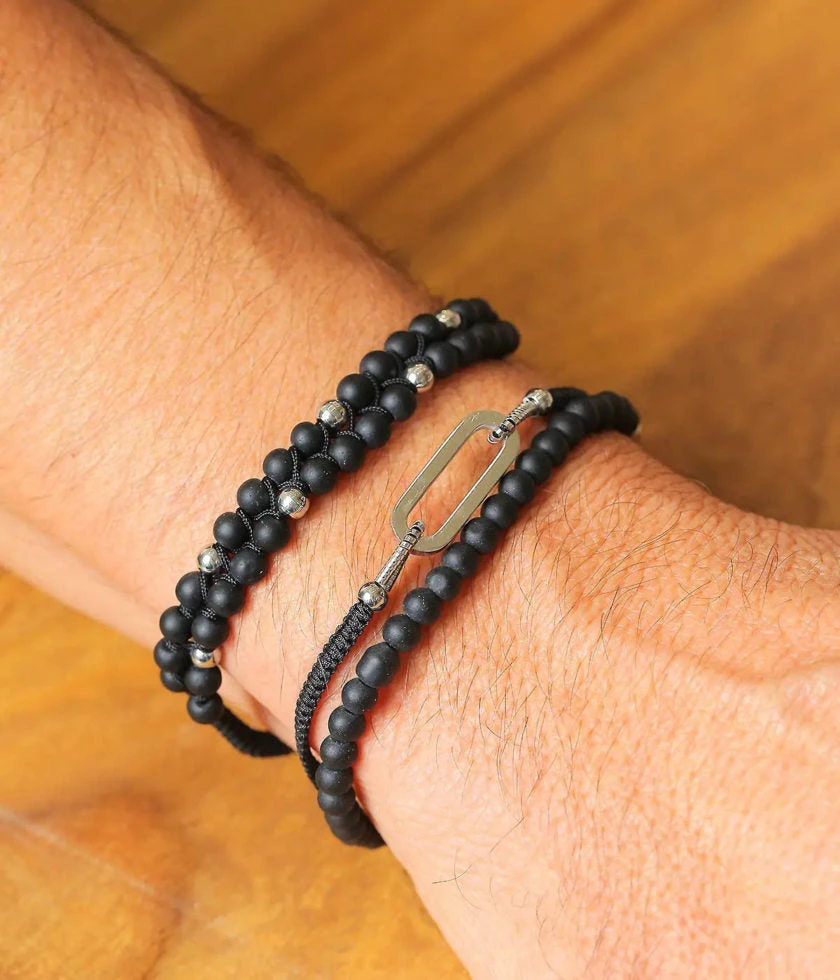 Bracelet cordon ajustable sur lequel sont enfilées des perles d’onyx et de métal. Un motif en acier ovale très contemporain se place au-dessus du poignet dans une allure moderne et chic.
