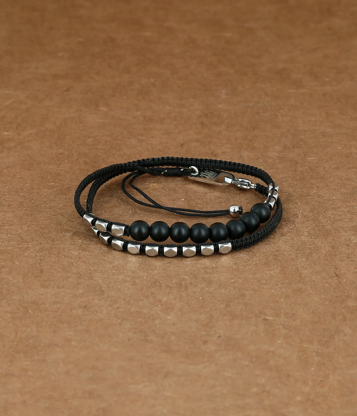 Bracelet cordon qui s’enlace deux fois autour du poignet. Des boules d’onyx noir ou de pierre de lave sont mélangées à des petites pièces de métal.