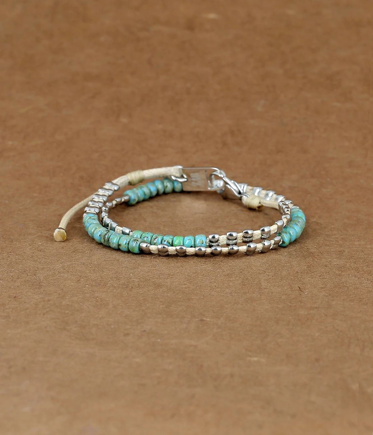 Bracelet multi-tours sur lequel sont enfilées des pierres turquoise africaine et des pièces en acier.