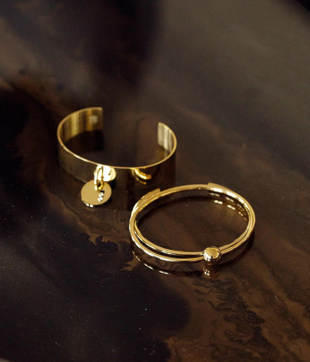 Bracelet jonc en acier uni ou doré à l’or fin sur lequel est attaché une boule de métal dorée. Il est parfait pour celles qui aiment les bijoux modernes et simples.
