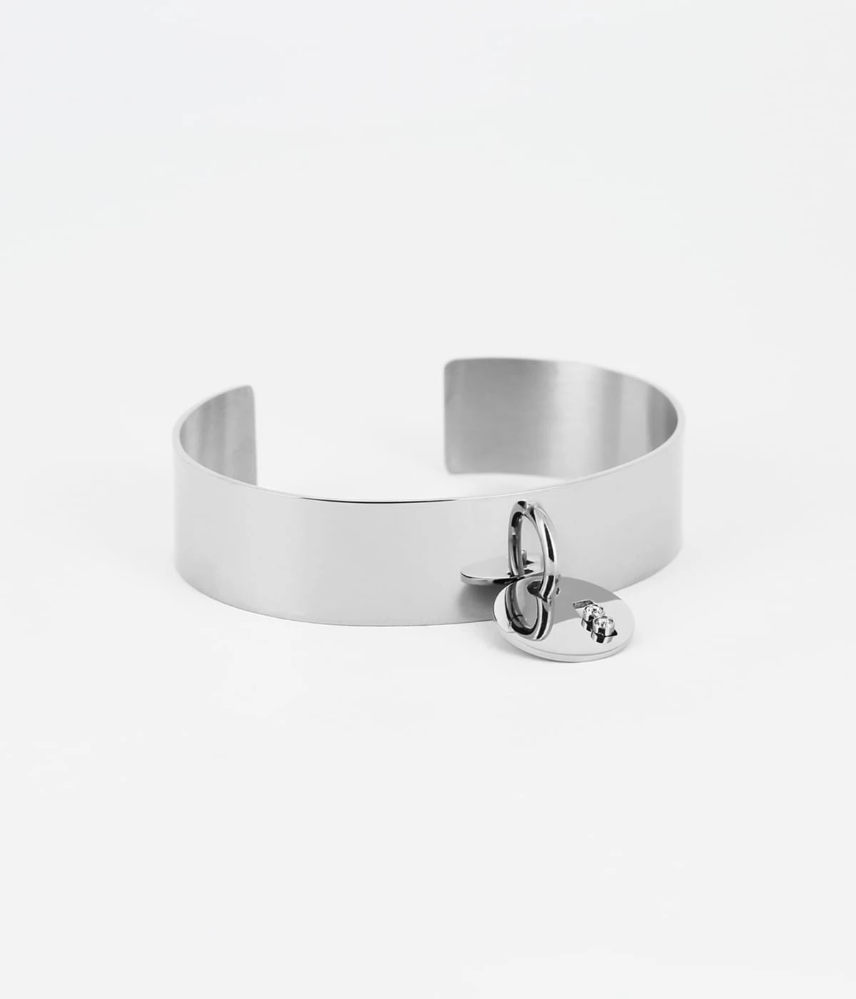 Bracelet jonc en acier uni ou doré à l’or fin sur lequel est attaché une pampille doté de deux zirconiums.