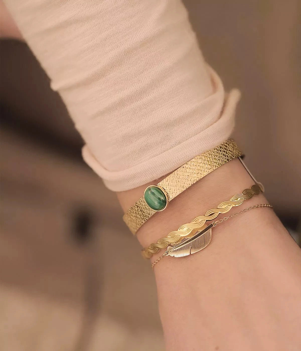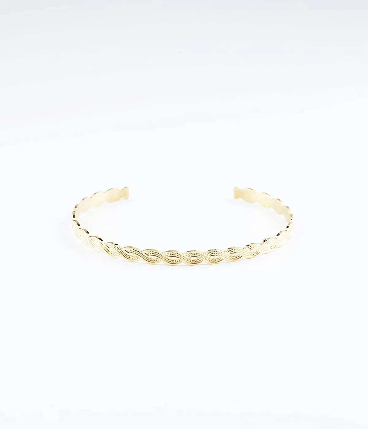 Bracelet jonc en acier uni ou doré à l’or fin dont l’apparence évoque une fine tresse.