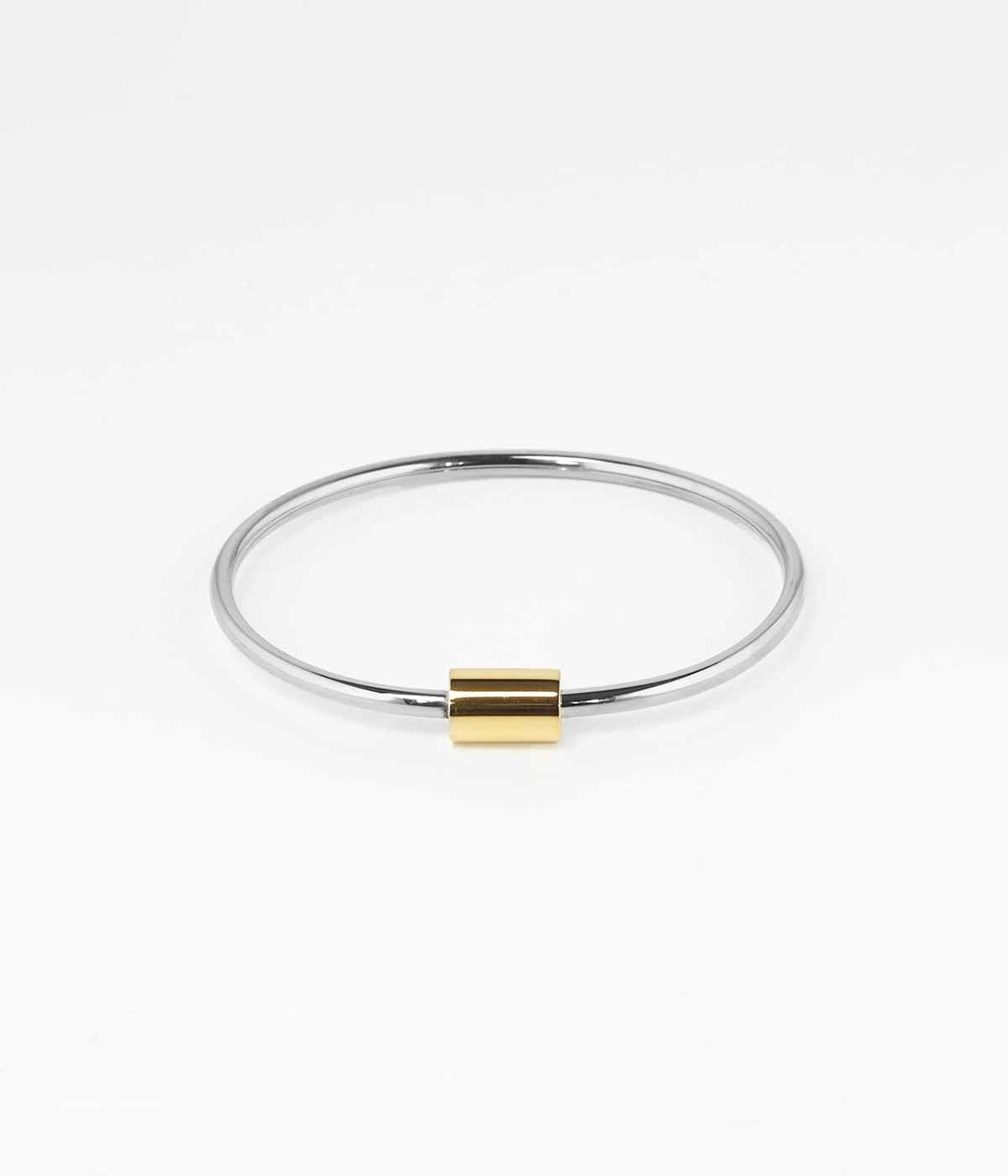 Bracelet jonc en acier uni ou doré à l’or fin. Le métal est à l’honneur et en son centre un cylindre doré fait office de motif.