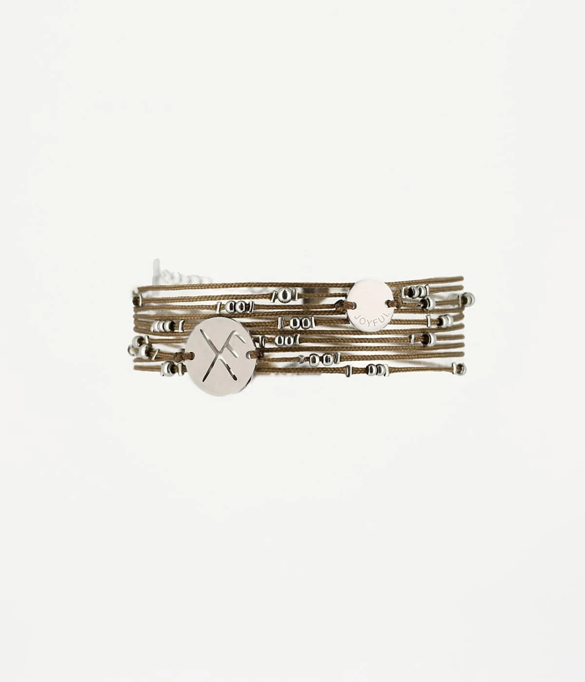 Bracelet cordons sur lesquels sont enfilées des boules d’acier et des plaques rondes gravées du mot « joyful » et d’une rune.
