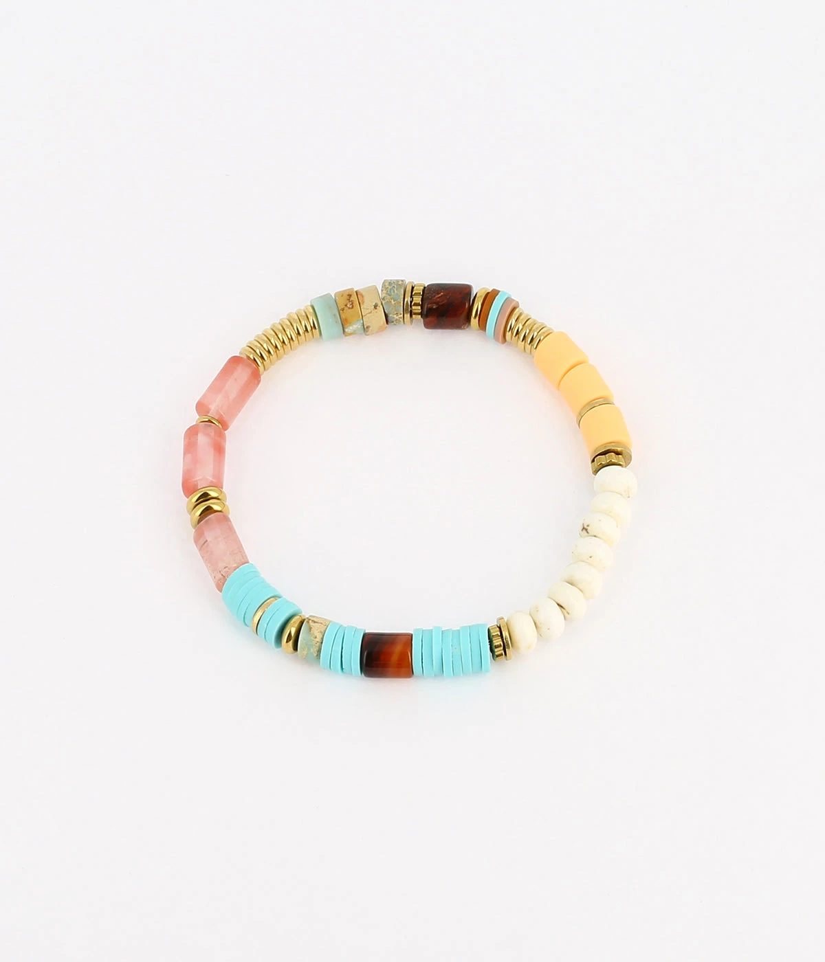 Les pierres sont mélangées formant des rayures multicolores sur le poignet.