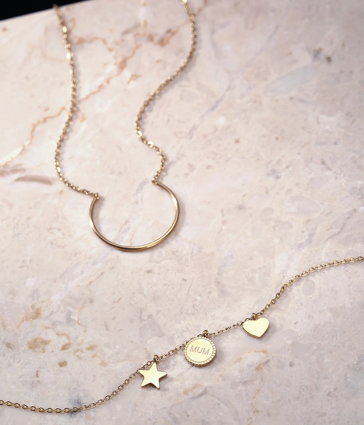 Bracelet chaînette en acier uni ou doré à l’or fin sur lequel sont attachées une petite médaille gravée avec le mot « Mum » et des petites pampilles en forme d’étoile et de cœur.