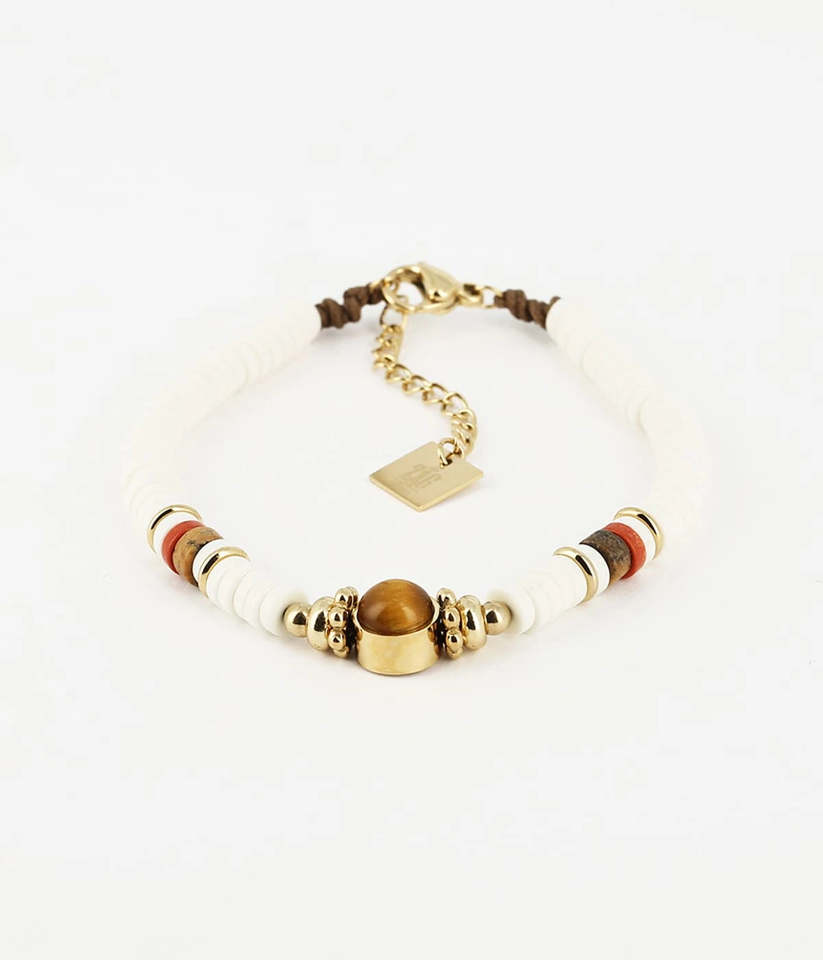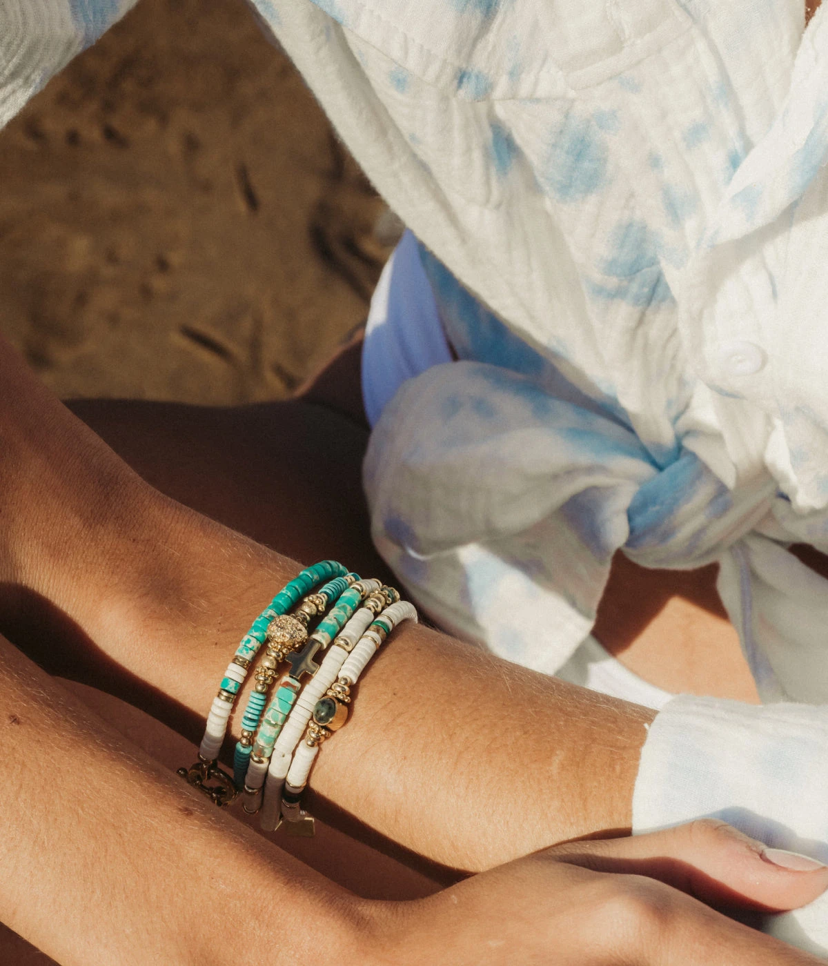Ce bracelet se porte mélangé avec d’autres bracelets de surfeur et son allure raffinée permet de le porter tout l’été le jour comme le soir.