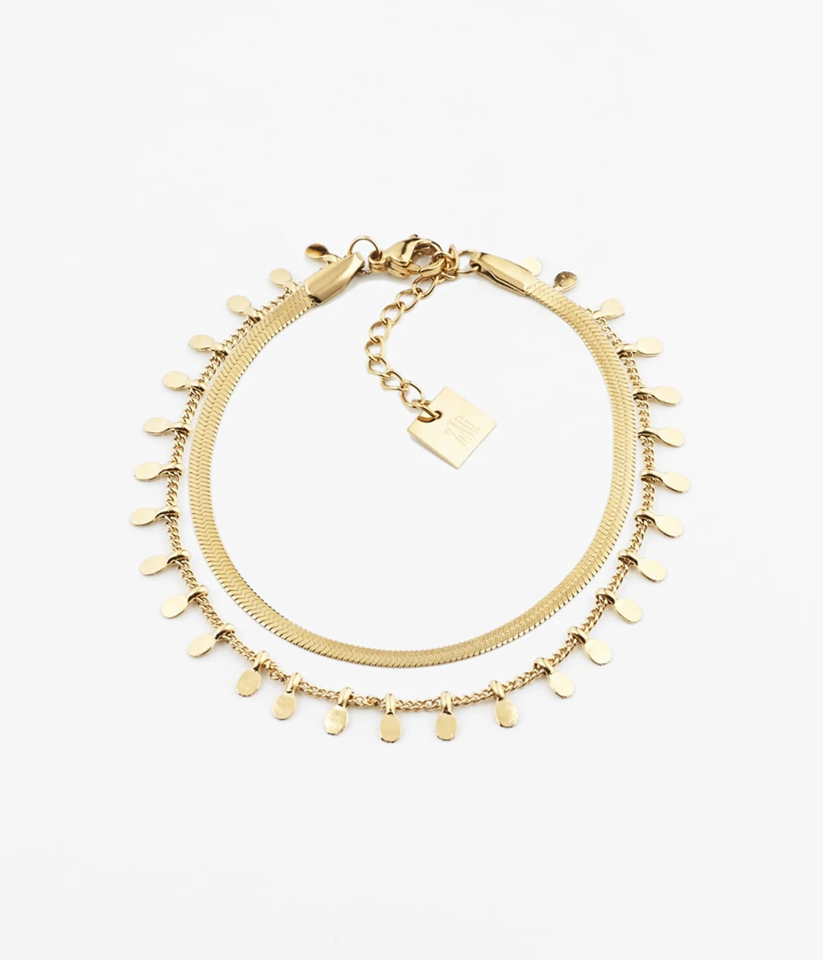 Bracelet double chaînette en acier uni ou doré à l’or fin sur lequel est attachée une rangée de pampilles en métal.