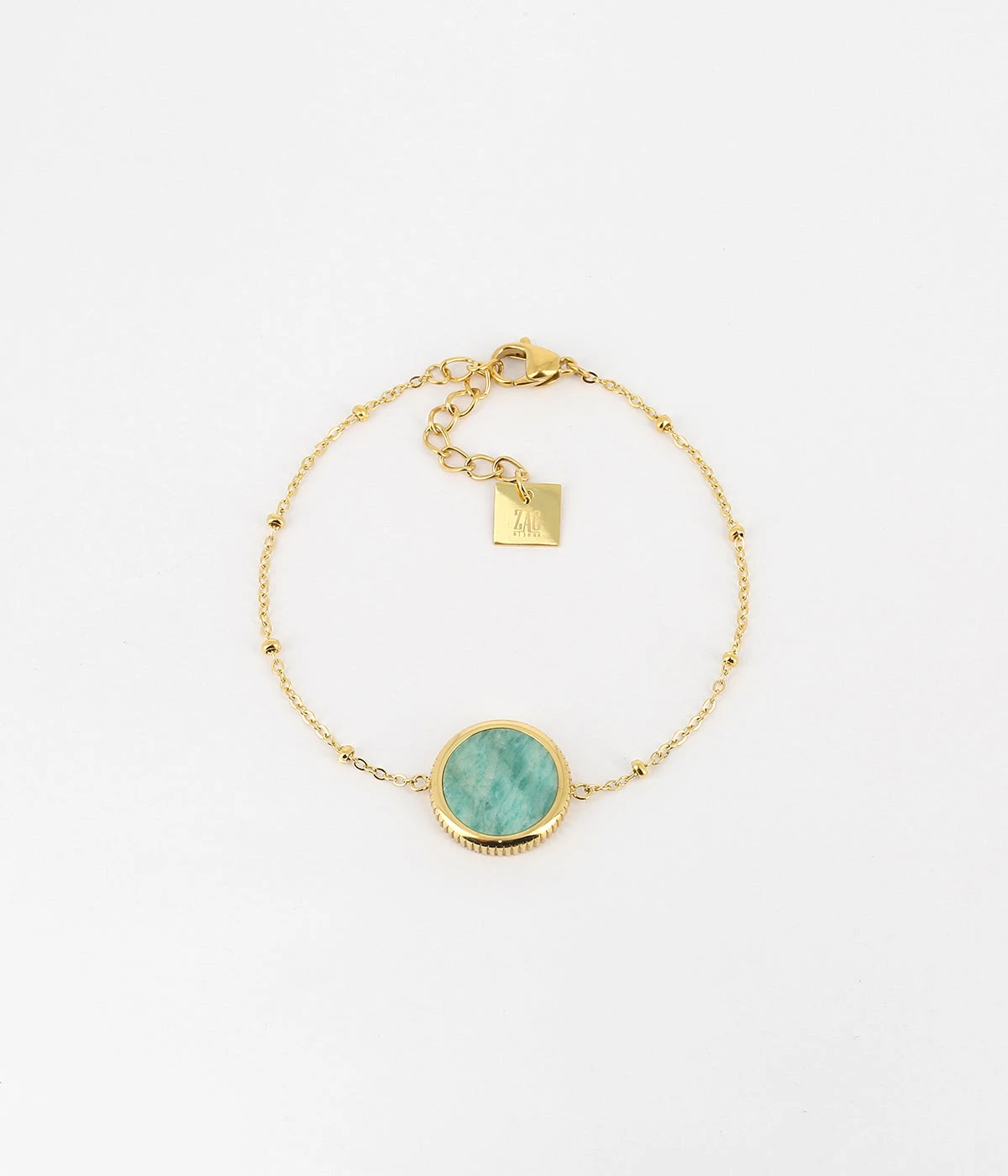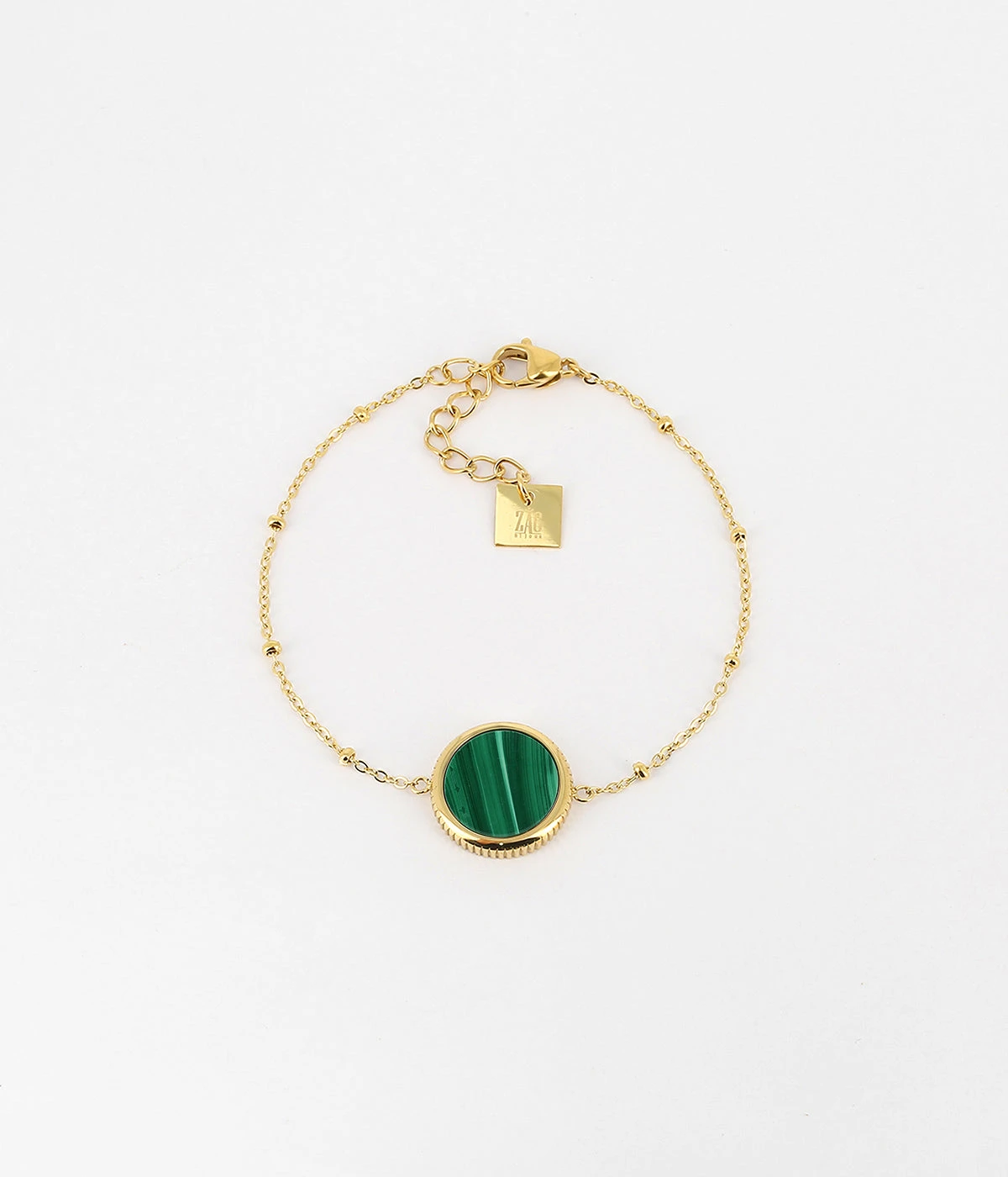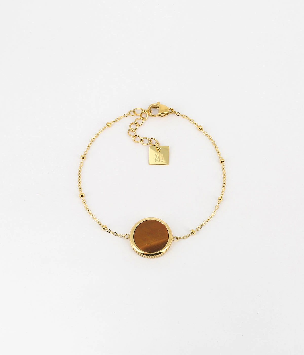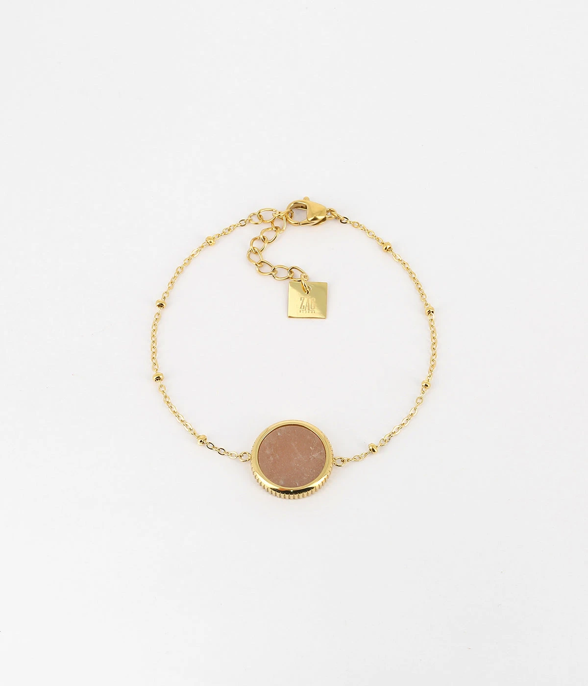 Bracelet en acier doré à l’or fin sur lequel est attachée une médaille constituée d’une pierre naturelle.
