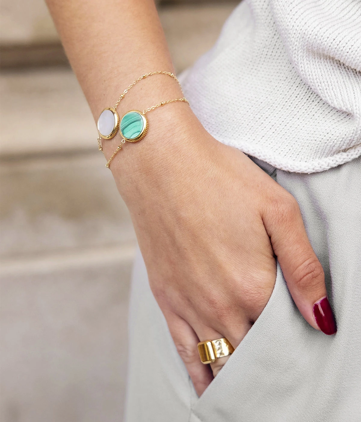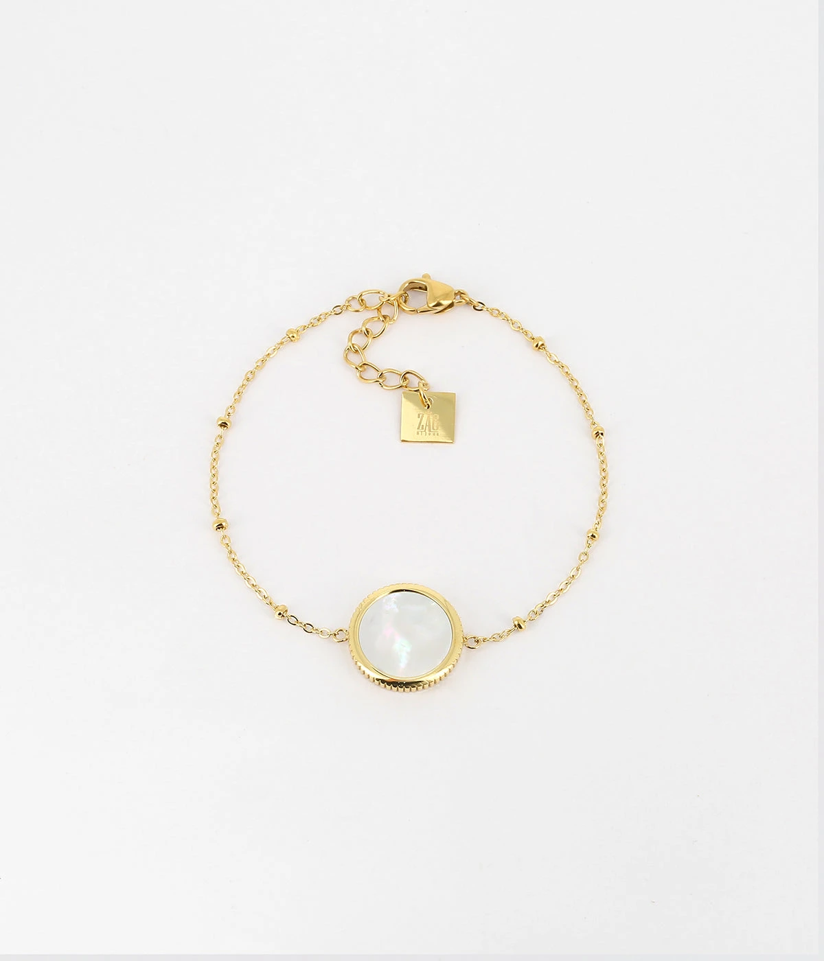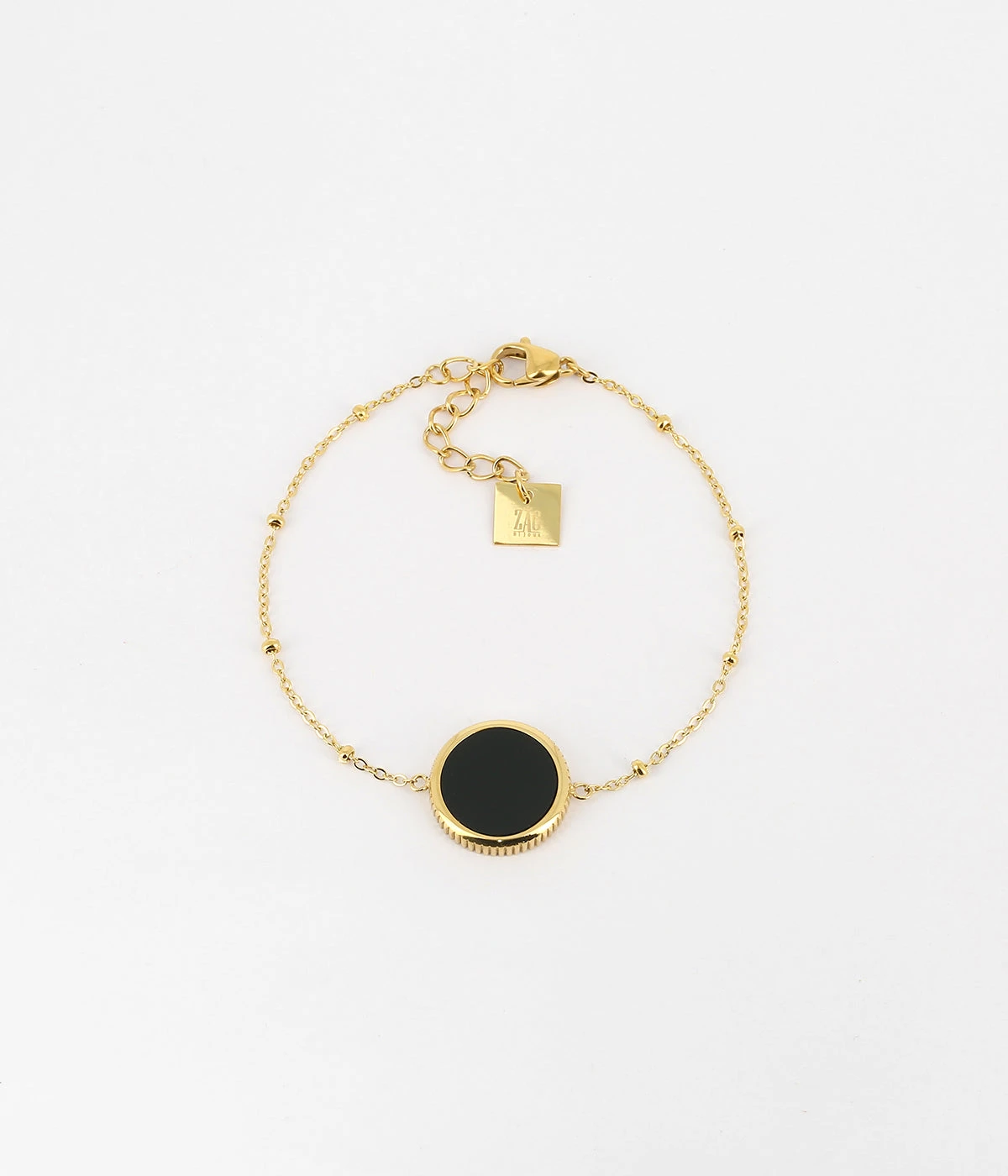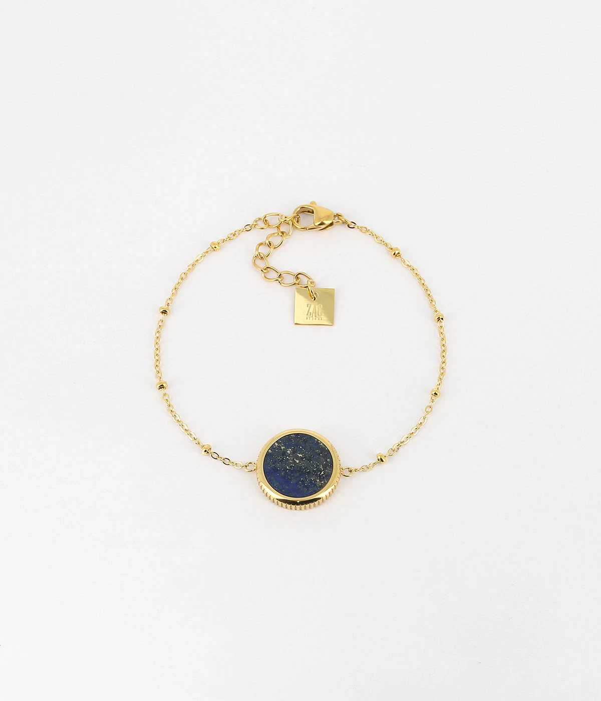 Bracelet en acier doré à l’or fin sur lequel est attachée une médaille constituée d’une pierre naturelle.