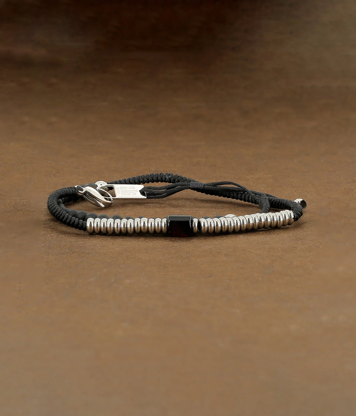 Bracelet cordon noir ajustable qui s’entoure deux fois autour du poignet et forme un double rang de boules en onyx noir et de perles d’acier uni.