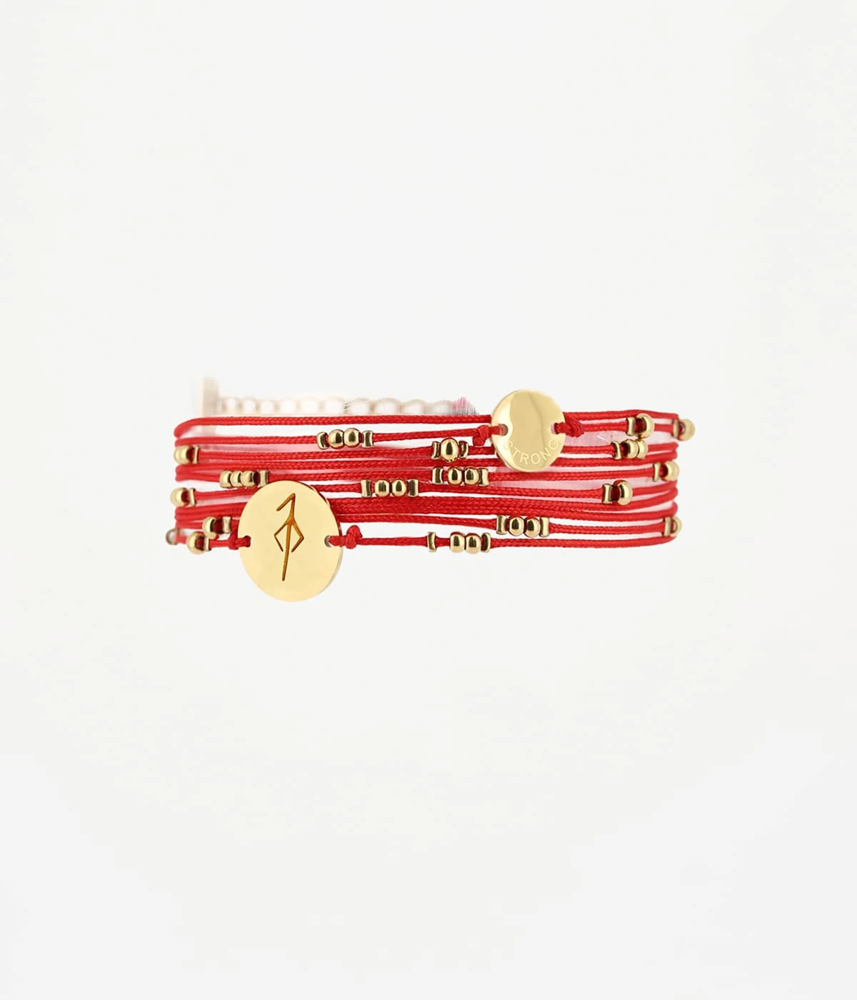 Bracelet cordons sur lesquels sont enfilées des boules d’acier et des plaques rondes gravées du mot « strong » et d’une rune.